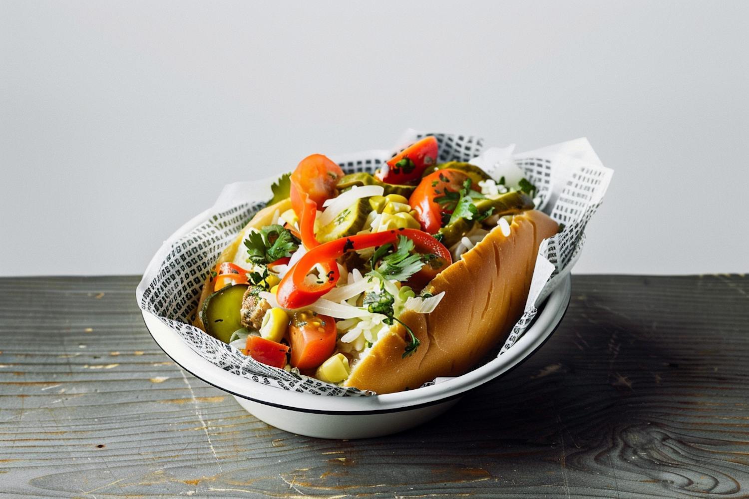Colorful hot dog topped with fresh vegetables, including red peppers, tomatoes, and pickles, served in a rustic bowl on a wooden table.