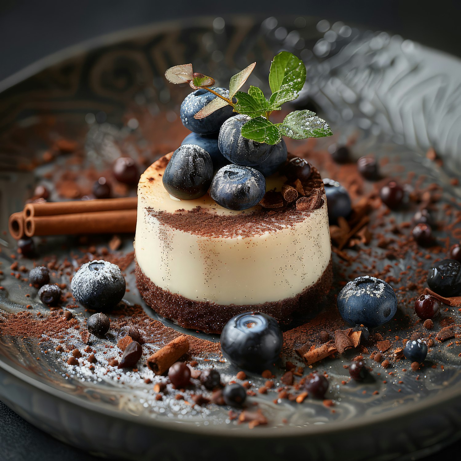 Elegant dessert with creamy layers, fresh blueberries, mint, and cinnamon on a dark plate. Perfect for gourmet dining.