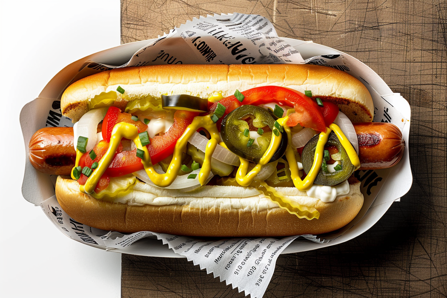Gourmet hot dog with vibrant toppings including tomatoes, onions, jalapeños, and mustard in a paper tray on a wooden surface.
