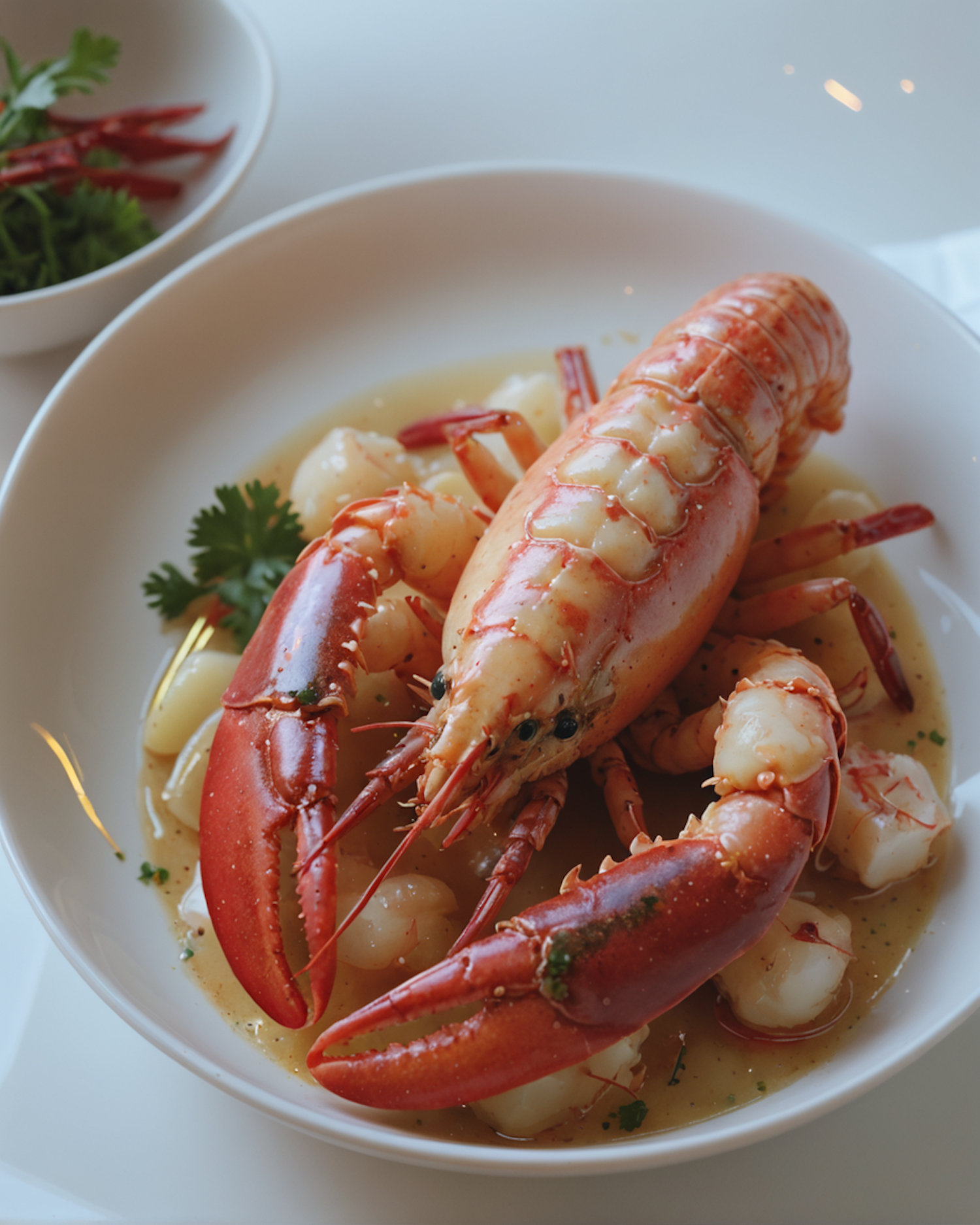 Elegant lobster dish with gnocchi in creamy sauce, garnished with parsley and chili. Perfect for gourmet seafood lovers.