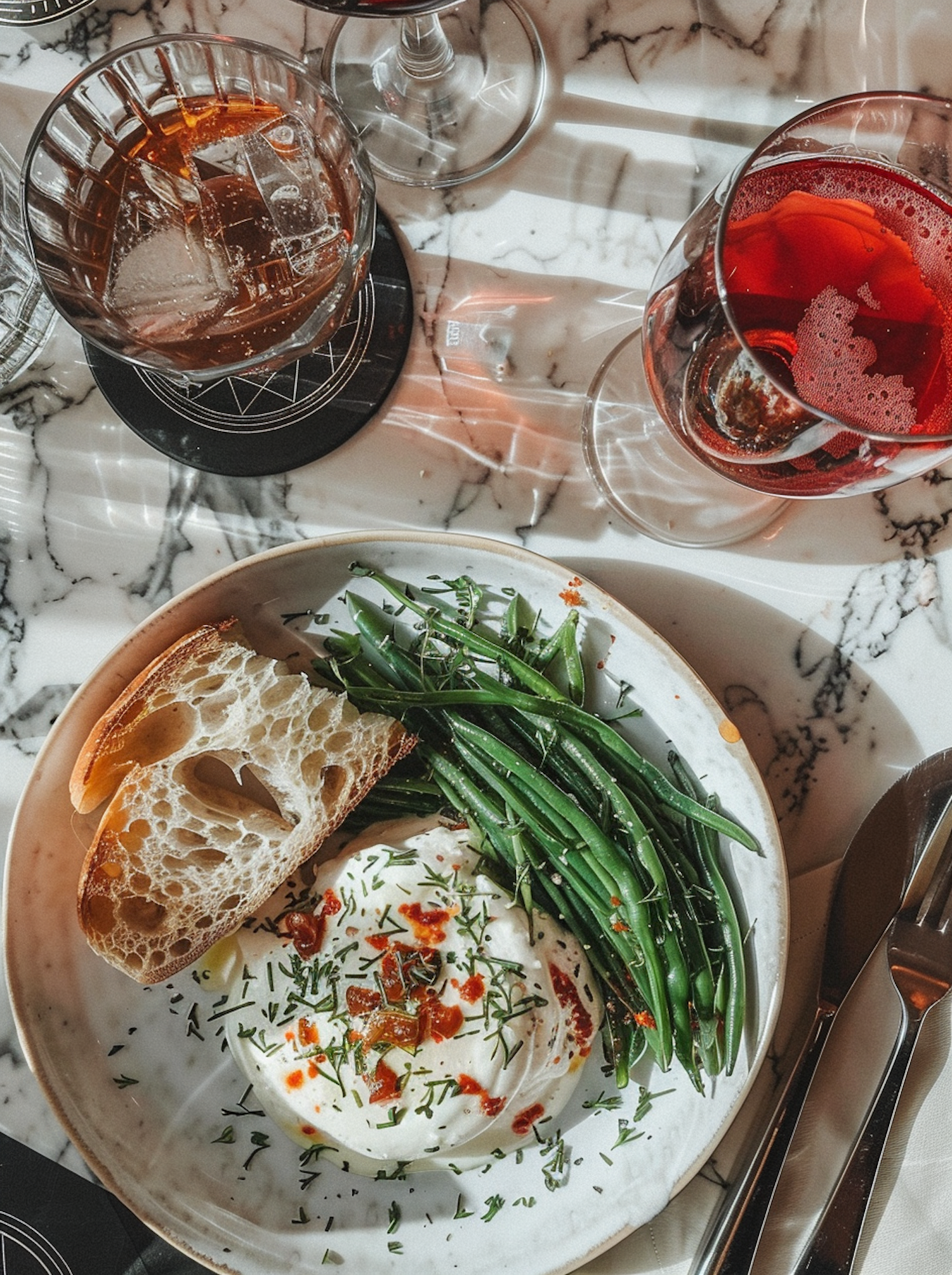 Elegant meal with burrata, green beans, and crusty bread, paired with red wine and a cocktail on a marble table.