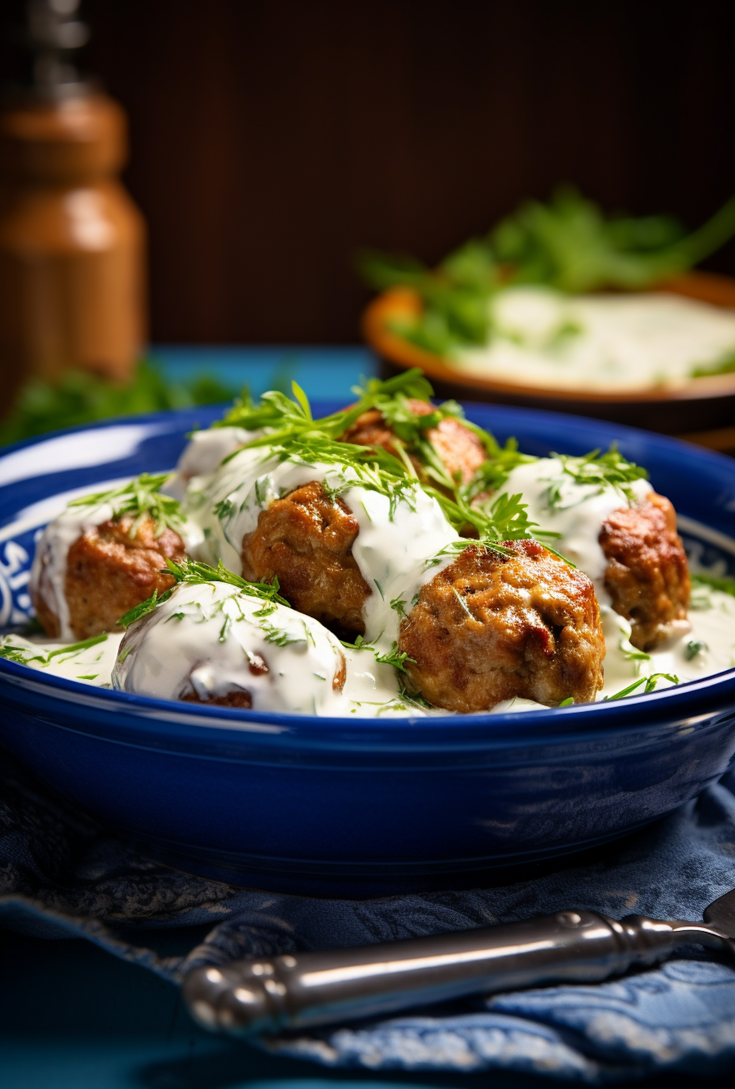 Delicious meatballs in creamy sauce garnished with fresh herbs in a blue bowl, perfect for a hearty meal.