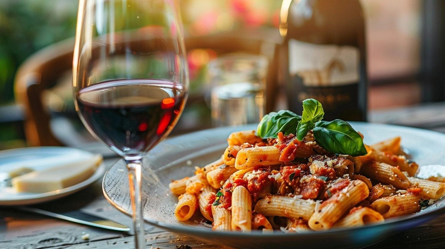 Elegant pasta dish with tomato sauce and basil, paired with a glass of red wine in a cozy dining setting.