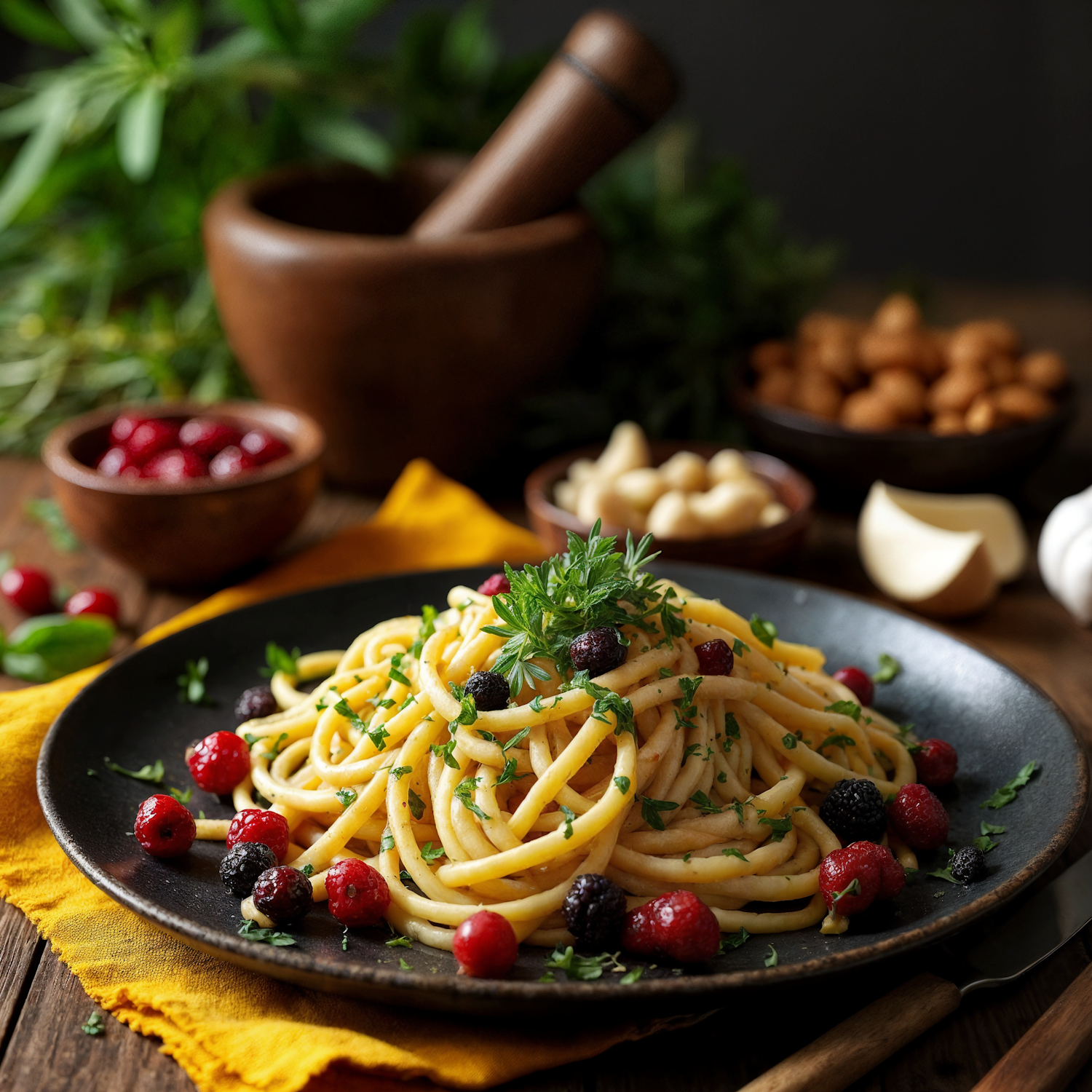 A delicious plate of pasta with fresh herbs and berries, surrounded by rustic kitchen elements like a mortar and pestle and bowls of ingredients.