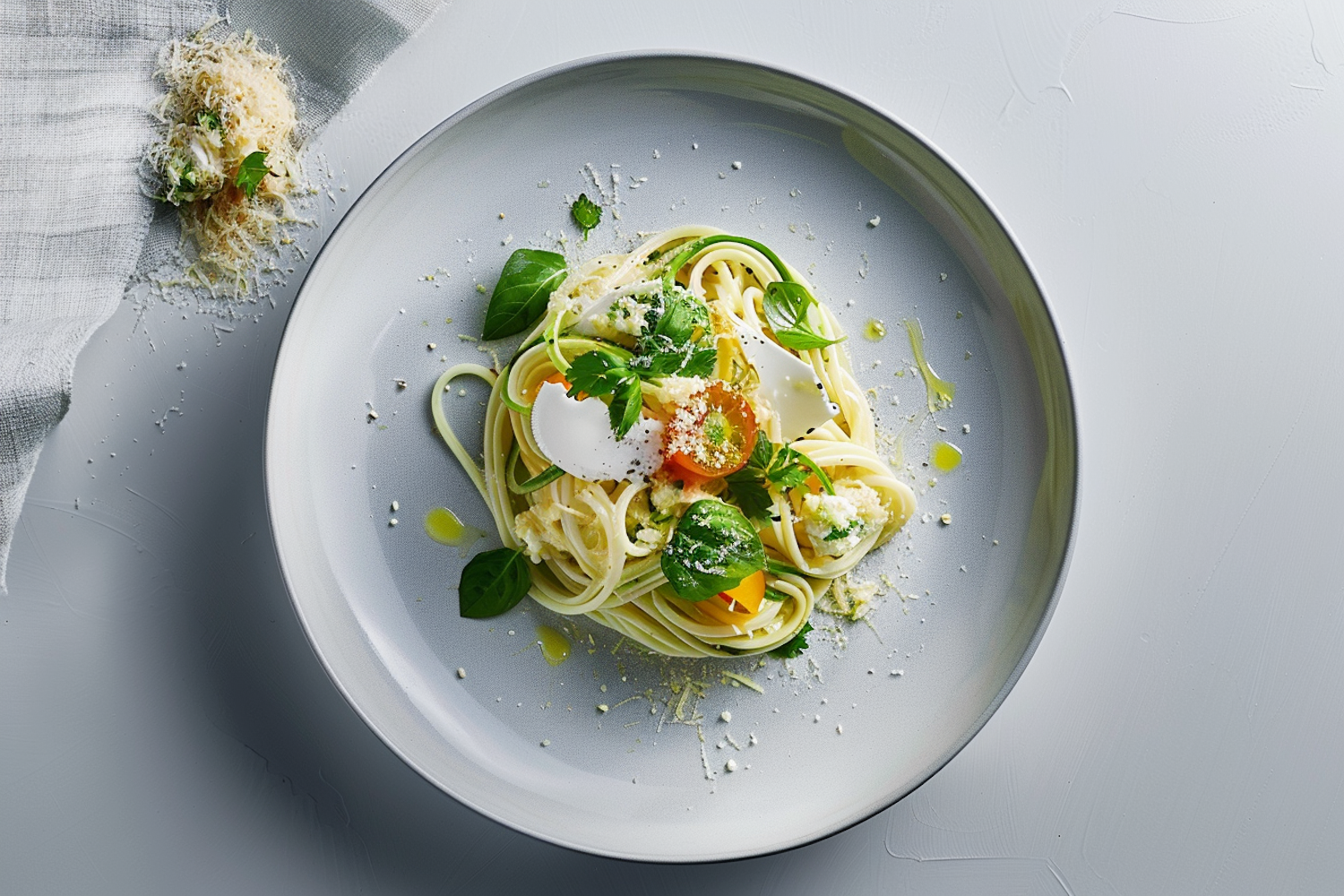 Elegant spaghetti dish with basil, zucchini, cherry tomatoes, and cheese on a gray plate, garnished with olive oil.
