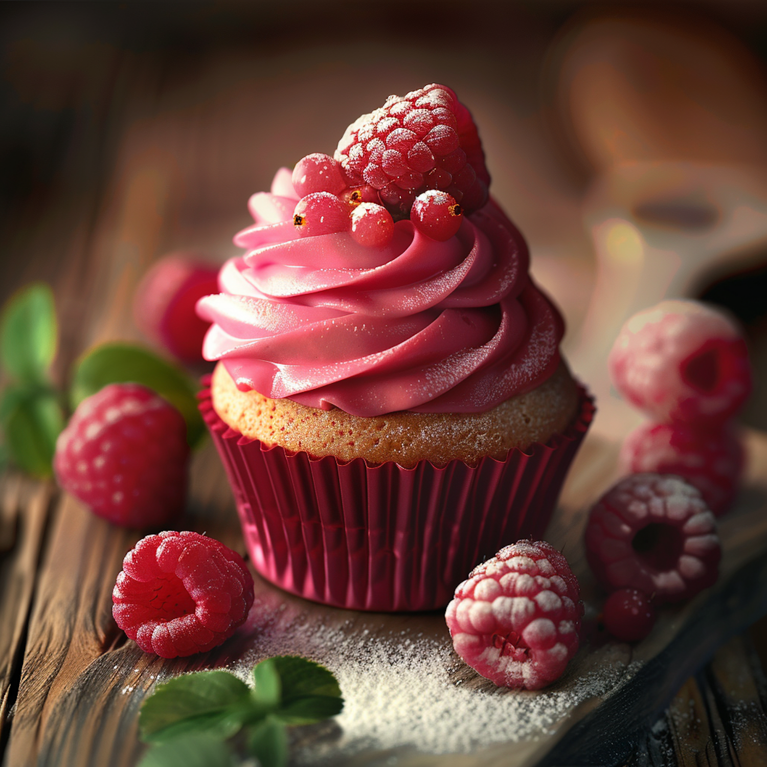 Delicious cupcake with pink frosting, fresh raspberries, and red currants, dusted with powdered sugar on a rustic wooden surface.