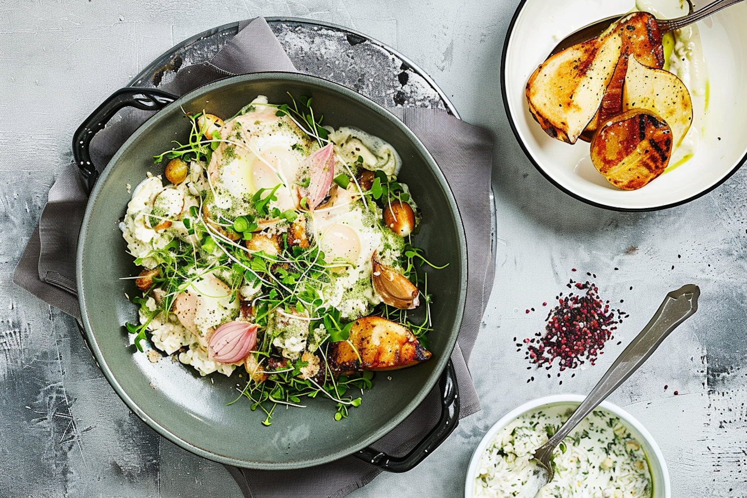 Elegant dish with poached eggs, roasted potatoes, and greens, accompanied by grilled pears and creamy herb sauce.