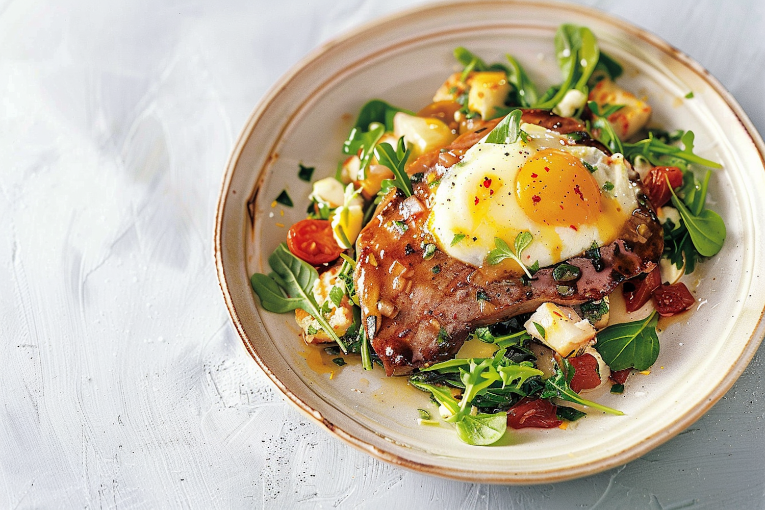 Delicious dish with meat, sunny-side-up egg, fresh greens, cherry tomatoes, and cheese on a rustic plate.