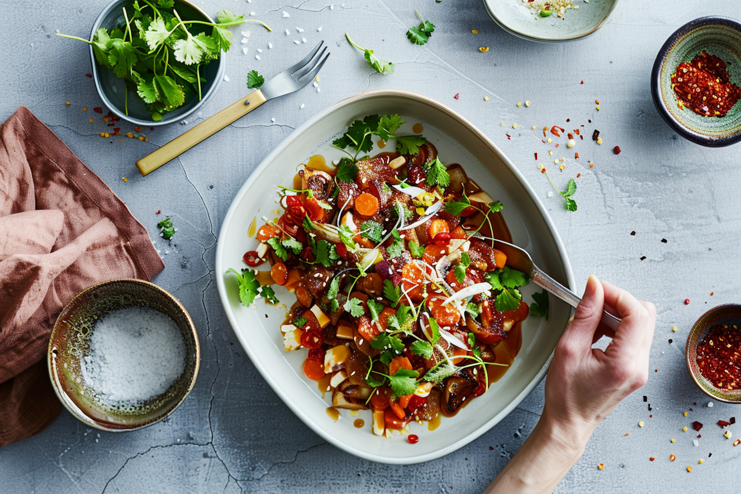 Colorful vegetable dish with carrots, mushrooms, and chili peppers, garnished with cilantro. A hand holds a fork, ready to enjoy.