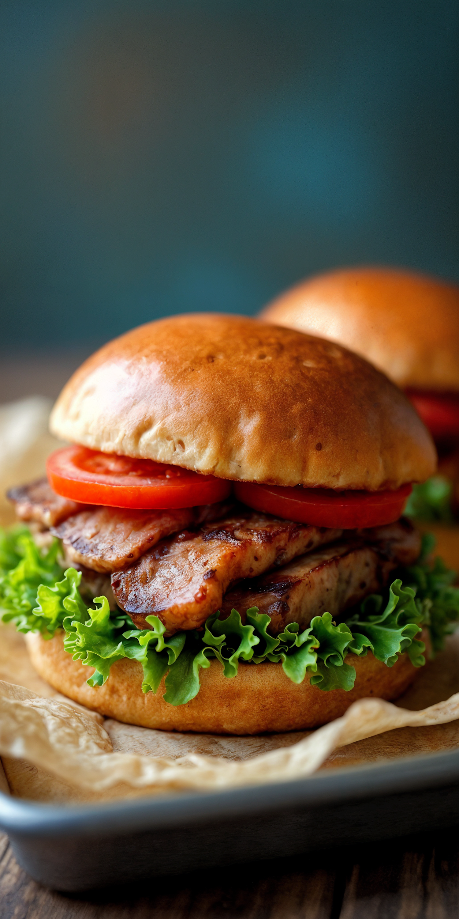 A delicious sandwich with grilled meat, fresh lettuce, and tomato on a golden brioche bun, served on a tray with parchment paper.