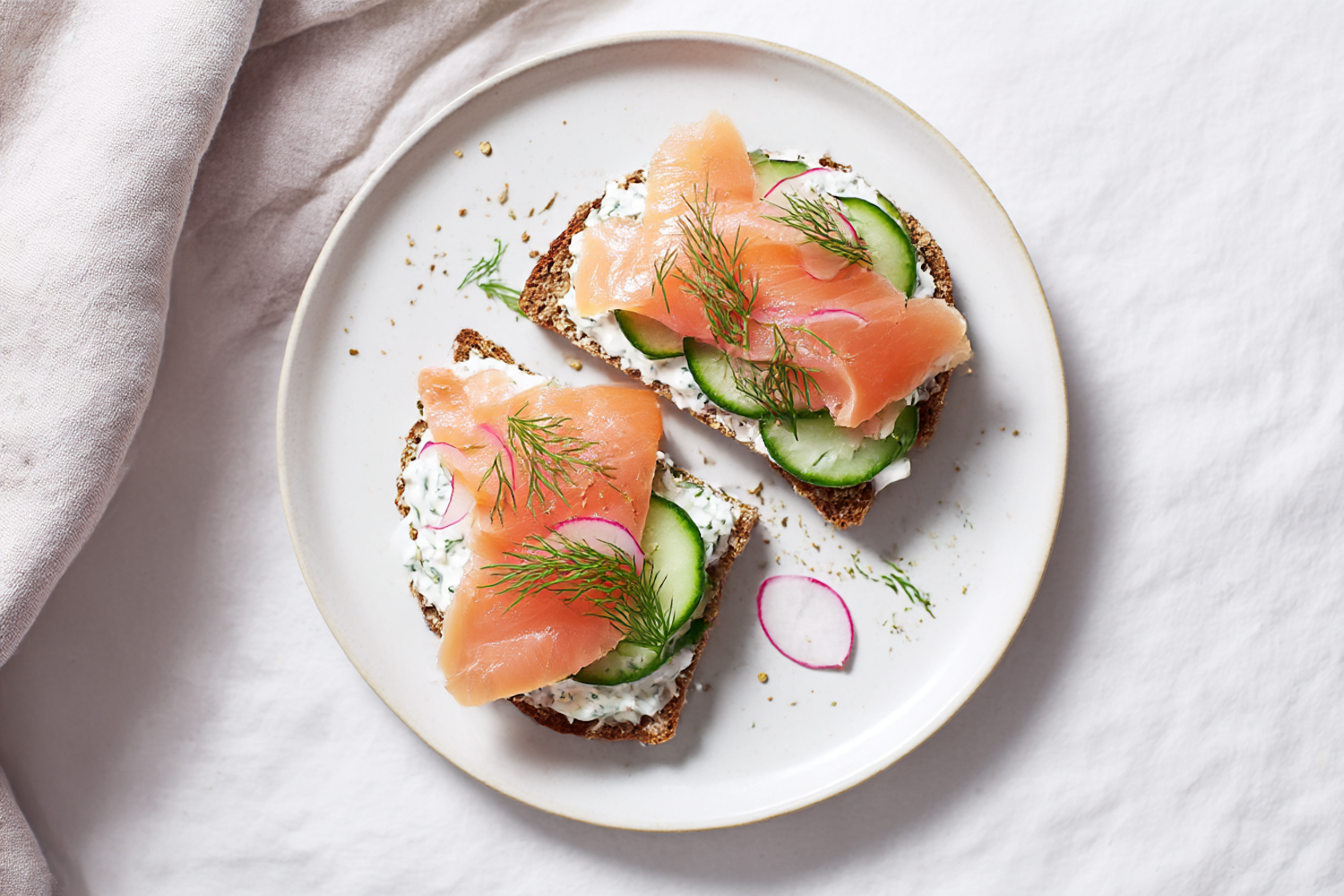 Delicious open-faced sandwiches with smoked salmon, cucumber, radish, and dill on rye bread with herbed cream cheese.