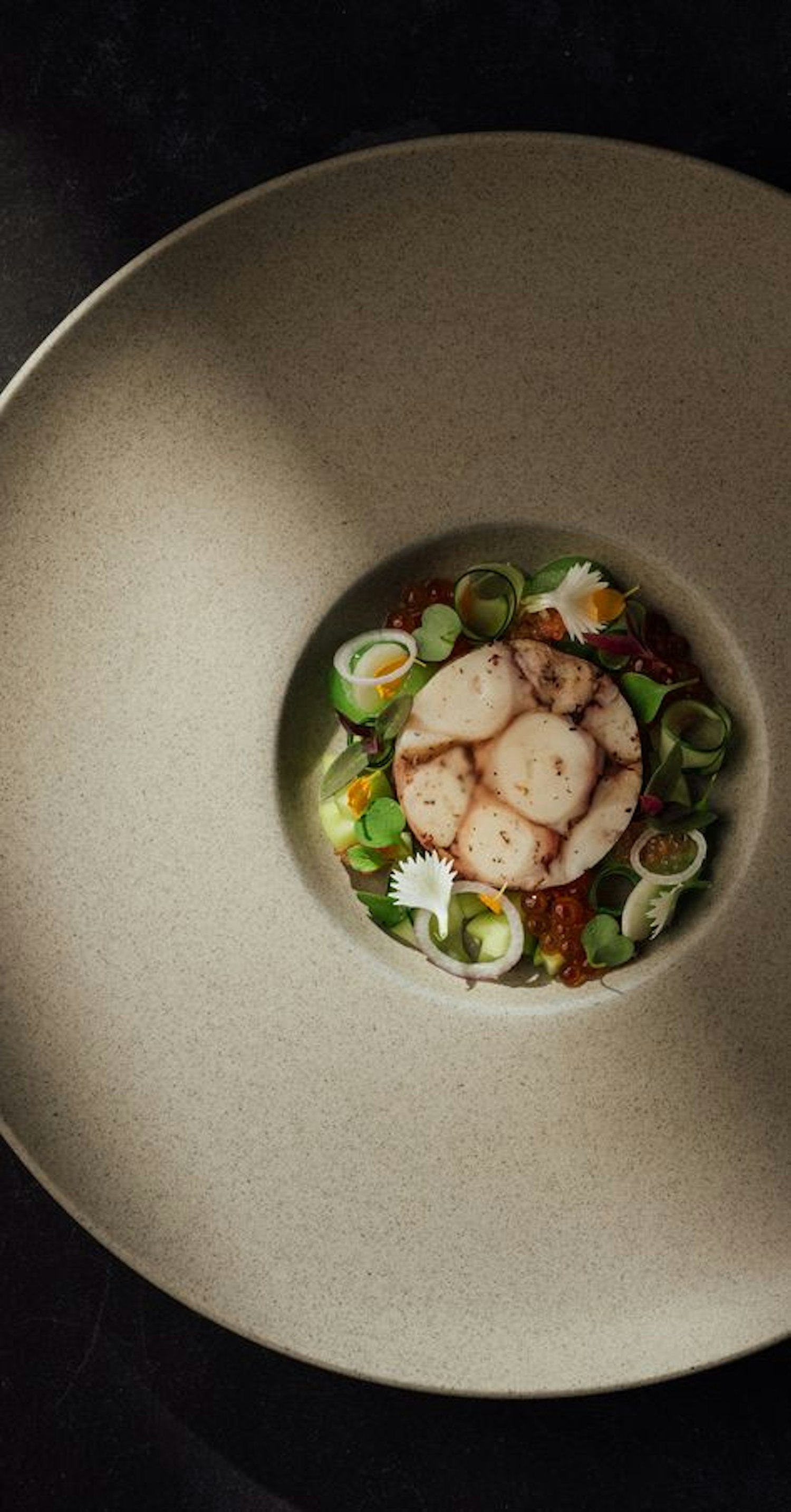 Elegant gourmet dish with seared scallops, microgreens, edible flowers, and fish roe in a textured beige bowl on a dark background.