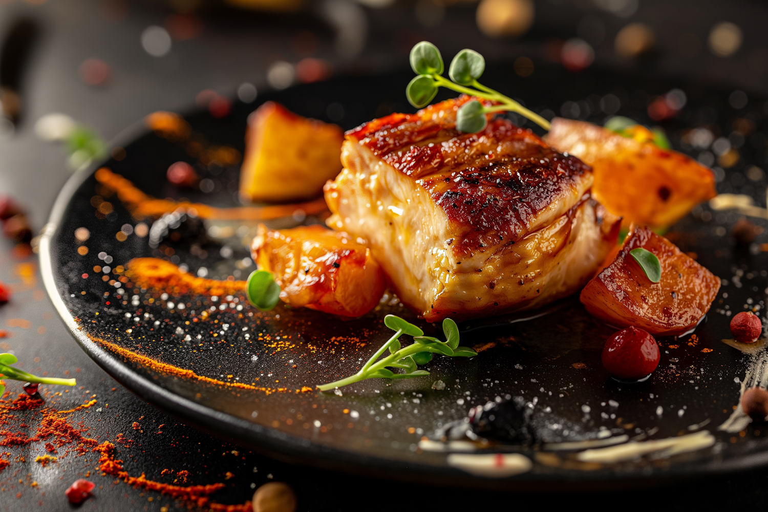 Gourmet grilled fish with microgreens, roasted sweet potatoes, and berries on a black plate, artistically garnished with spices.