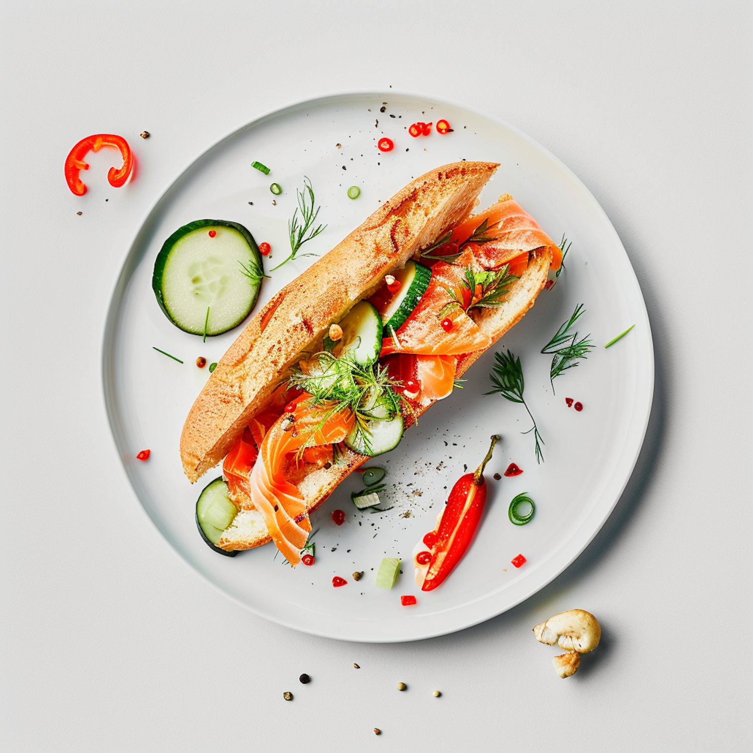 Delicious smoked salmon sandwich with cucumber and dill on a white plate, garnished with chili and peppercorns.
