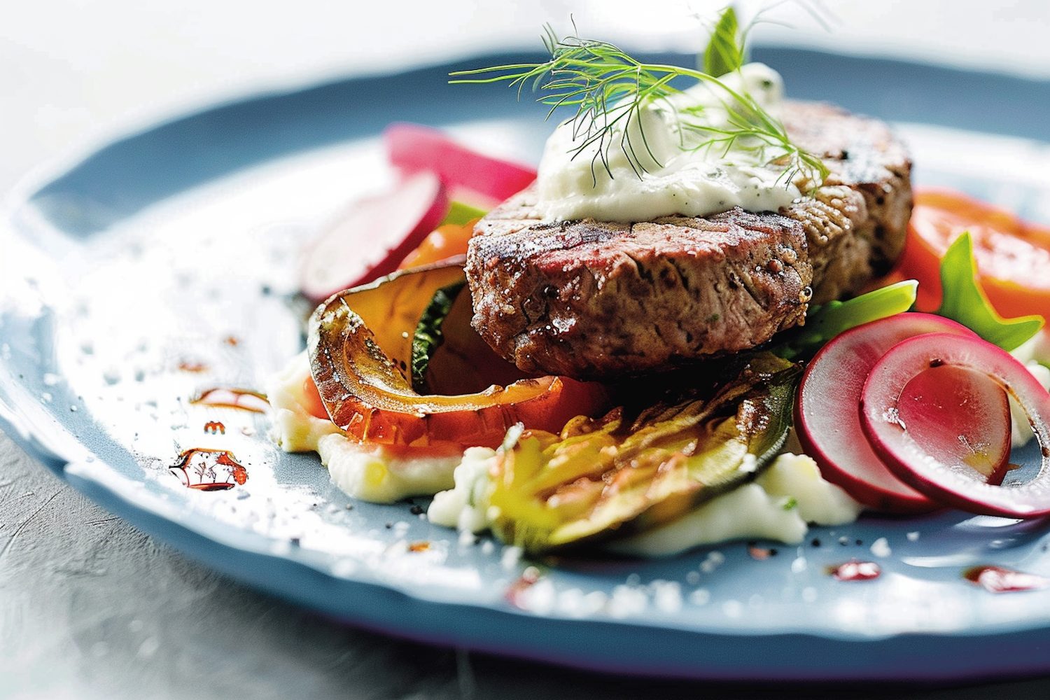 Gourmet steak dish with creamy sauce, grilled vegetables, and vibrant garnishes on a blue plate, elegantly presented.