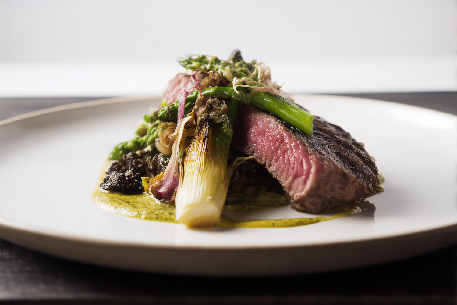 A beautifully plated medium-rare steak with asparagus, spring onions, mushrooms, and a green sauce on a white plate. Perfect for food lovers!