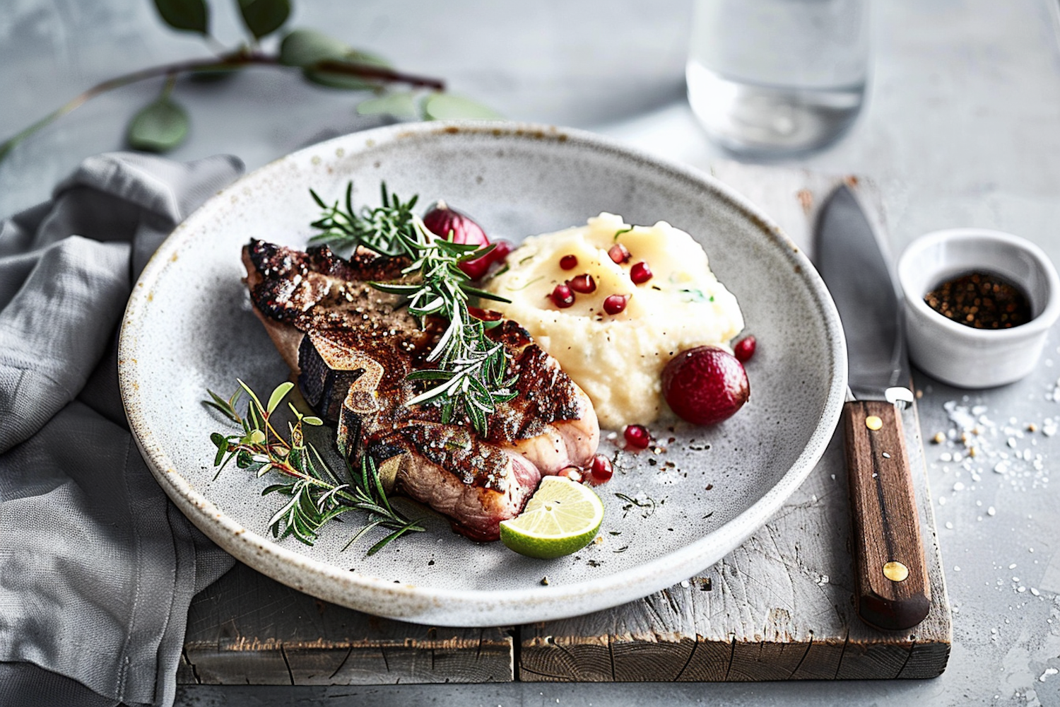 Grilled steak with rosemary, mashed potatoes, pomegranate seeds, and lime on a rustic plate. Elegant and appetizing presentation.