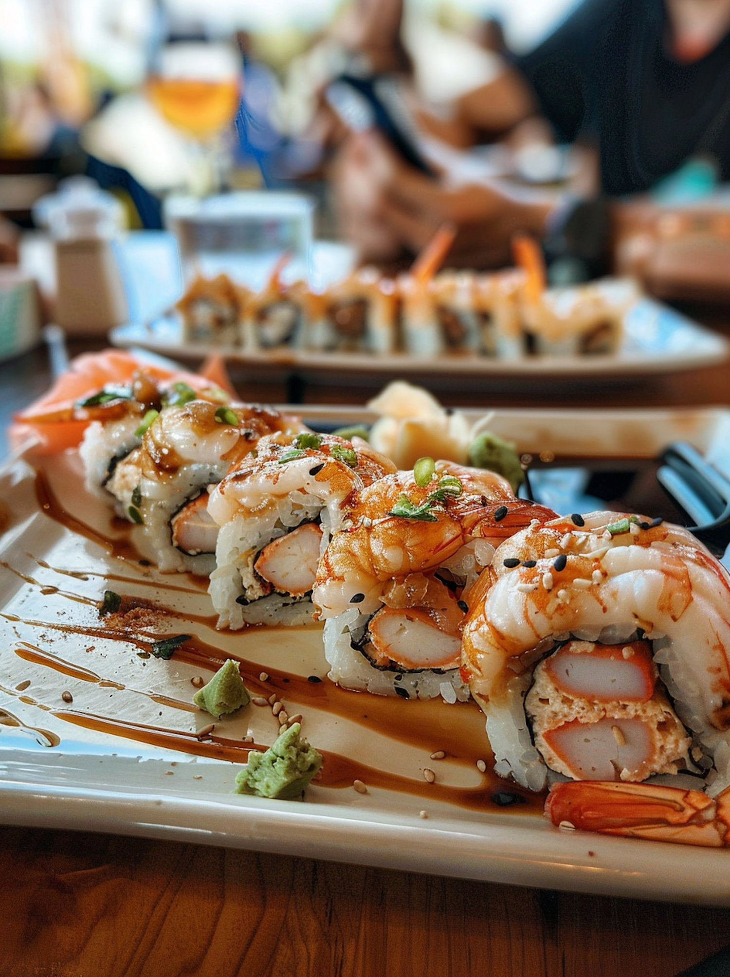Close-up of sushi rolls with shrimp, crab, and sauce, garnished with sesame seeds and green onions, on a wooden table.