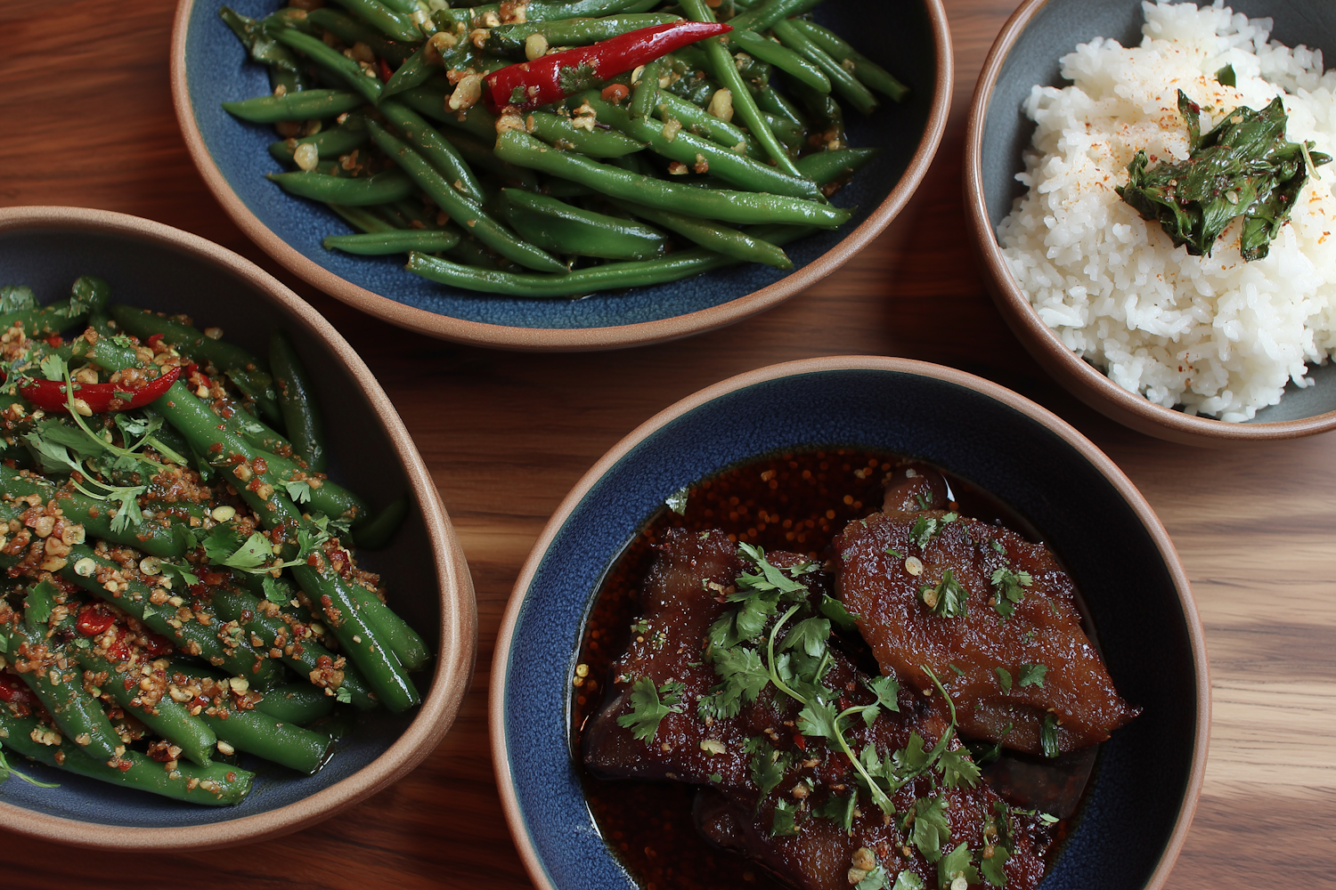 Chinese cuisine images: A vibrant spread of green beans, glazed pork, and rice presented in artisanal ceramic bowls on a wooden table.