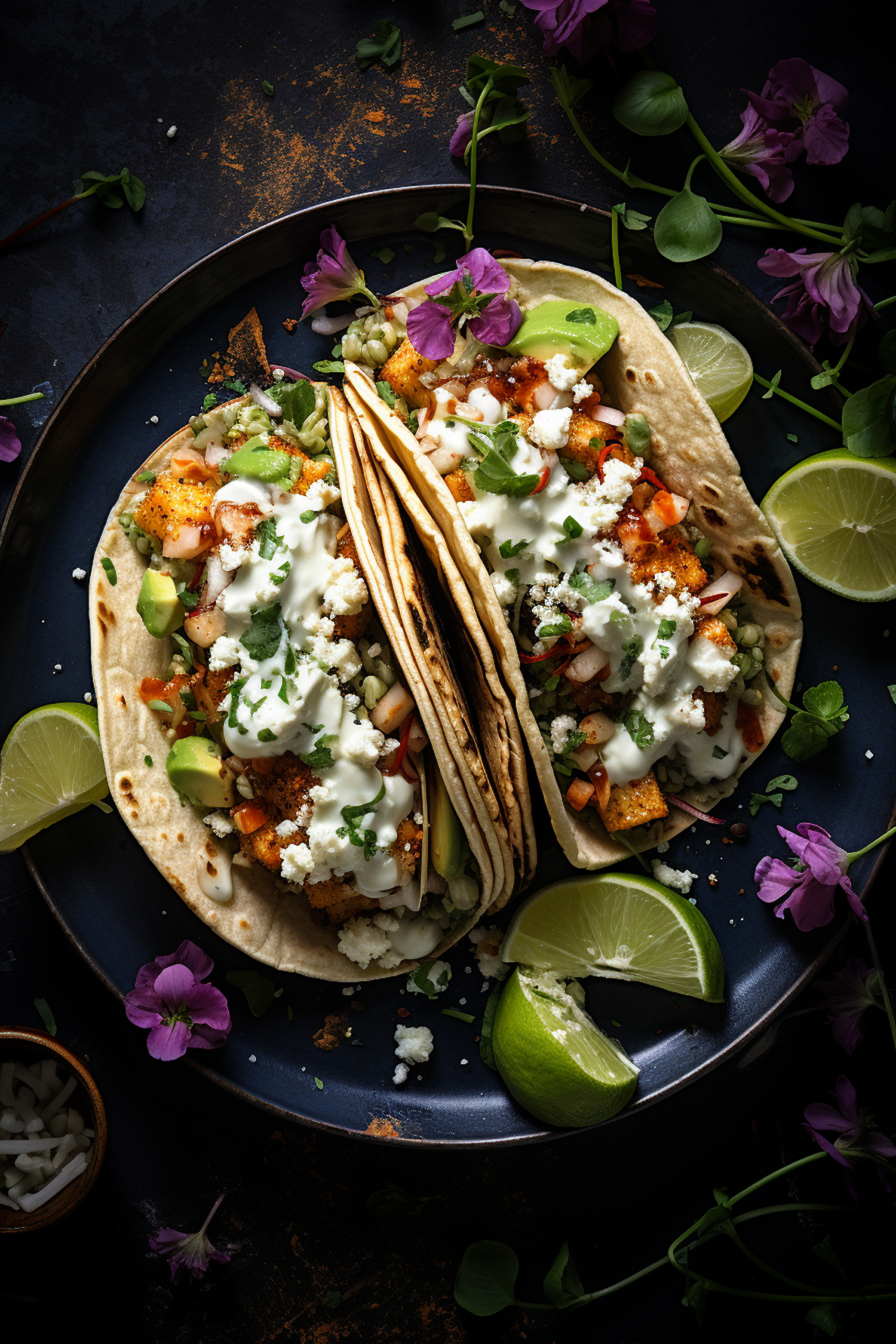 Vibrant tacos with crispy tofu, avocado, and creamy sauce on a dark plate, garnished with lime and purple flowers.