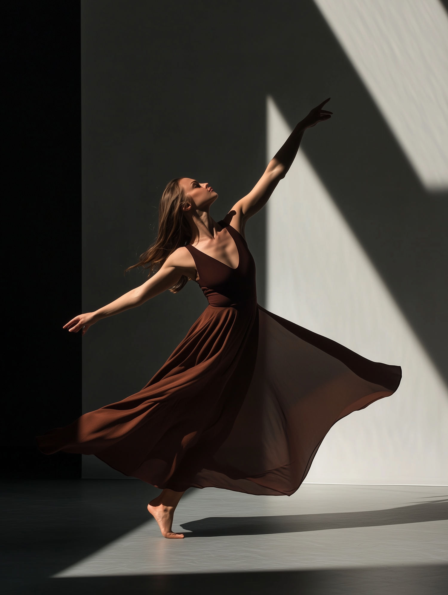 A dancer in a flowing brown dress strikes a graceful pose in dramatic lighting, with sharp shadows creating a minimalist, artistic vibe.