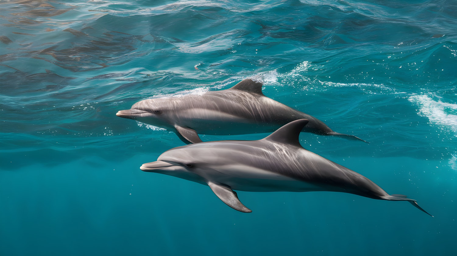 Two dolphins swimming gracefully in clear turquoise waters, showcasing their sleek bodies and playful nature.