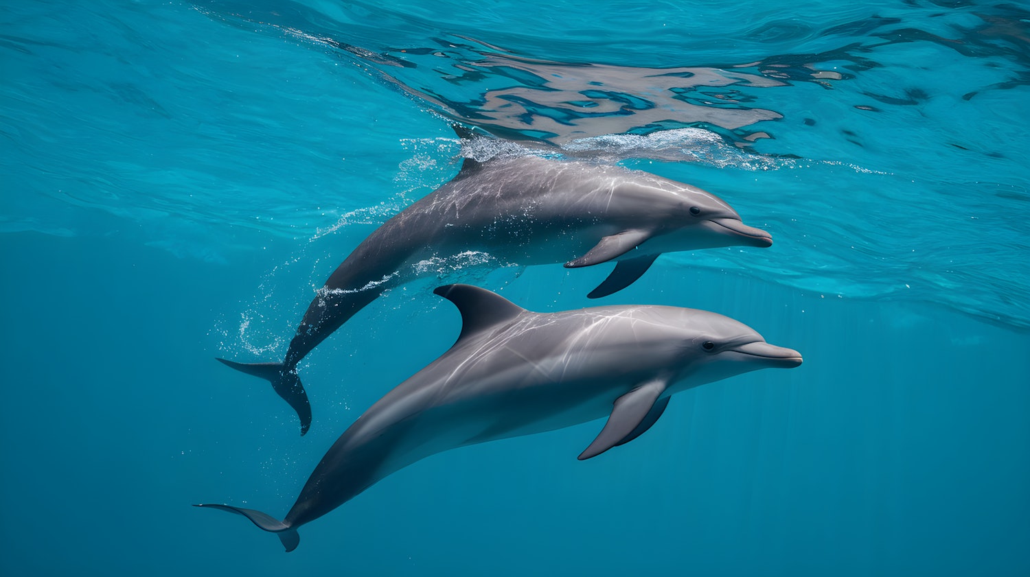 Two dolphins swimming gracefully in clear turquoise waters, showcasing their sleek bodies and harmonious movement.