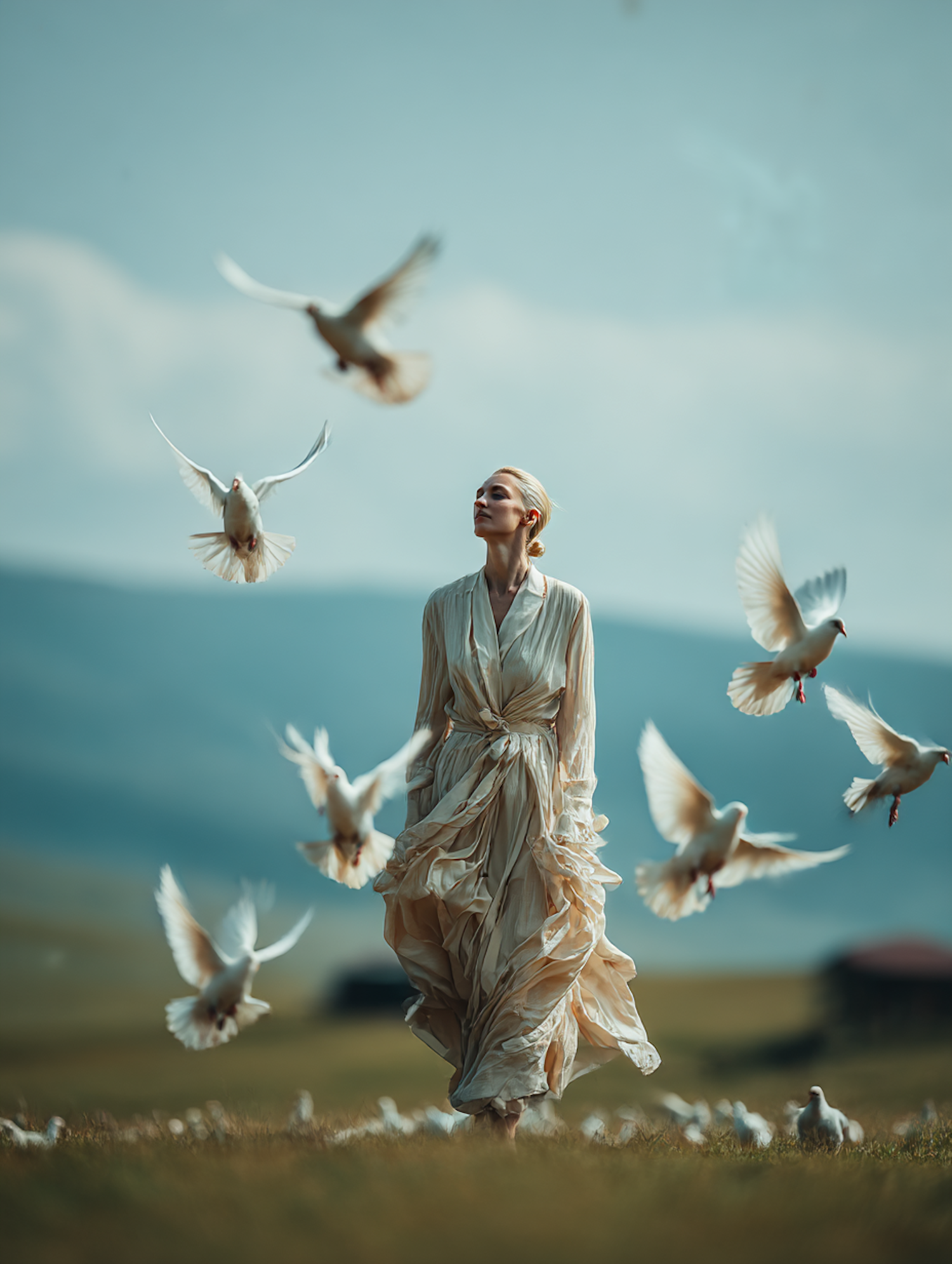 A serene woman in a flowing dress walks through a field surrounded by doves in flight, set against a backdrop of hills and a clear sky.