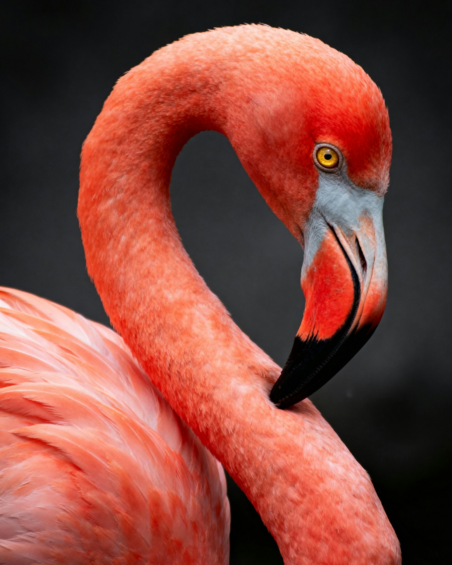 Close-up of a flamingo with vibrant pink feathers, a curved neck, and a striking yellow eye against a dark background.