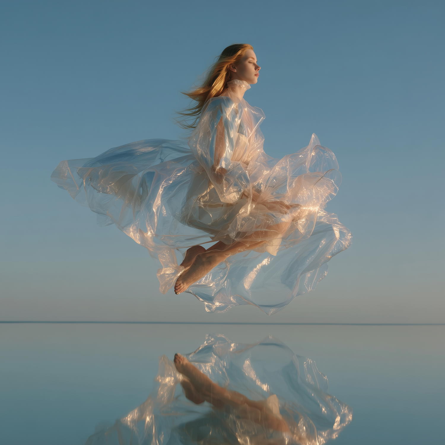 A serene image of a woman mid-air in a translucent dress, reflected on a calm surface under a clear blue sky.