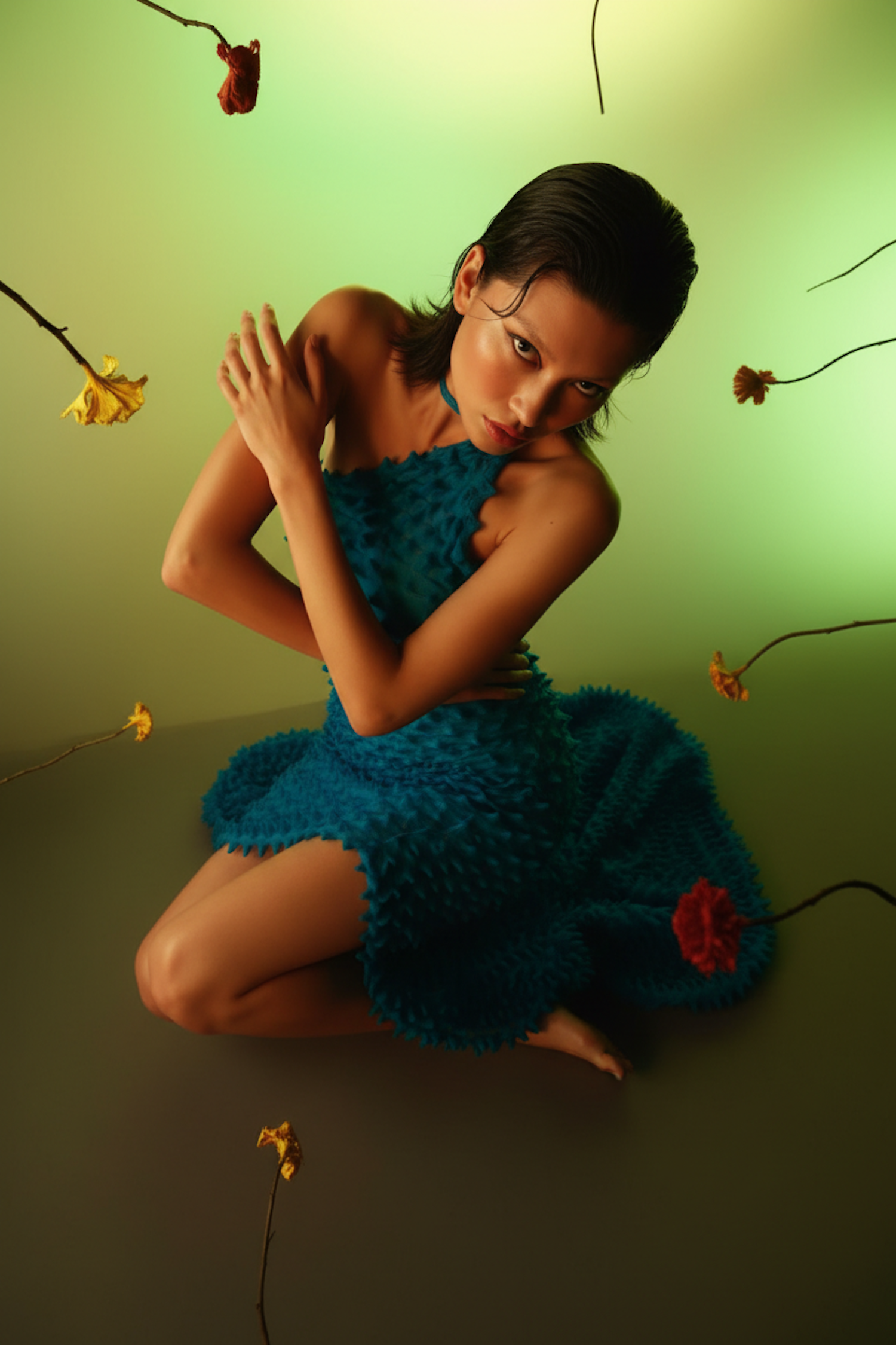 A woman in a textured blue dress poses artistically with dried flowers against a green gradient background, creating a serene composition.