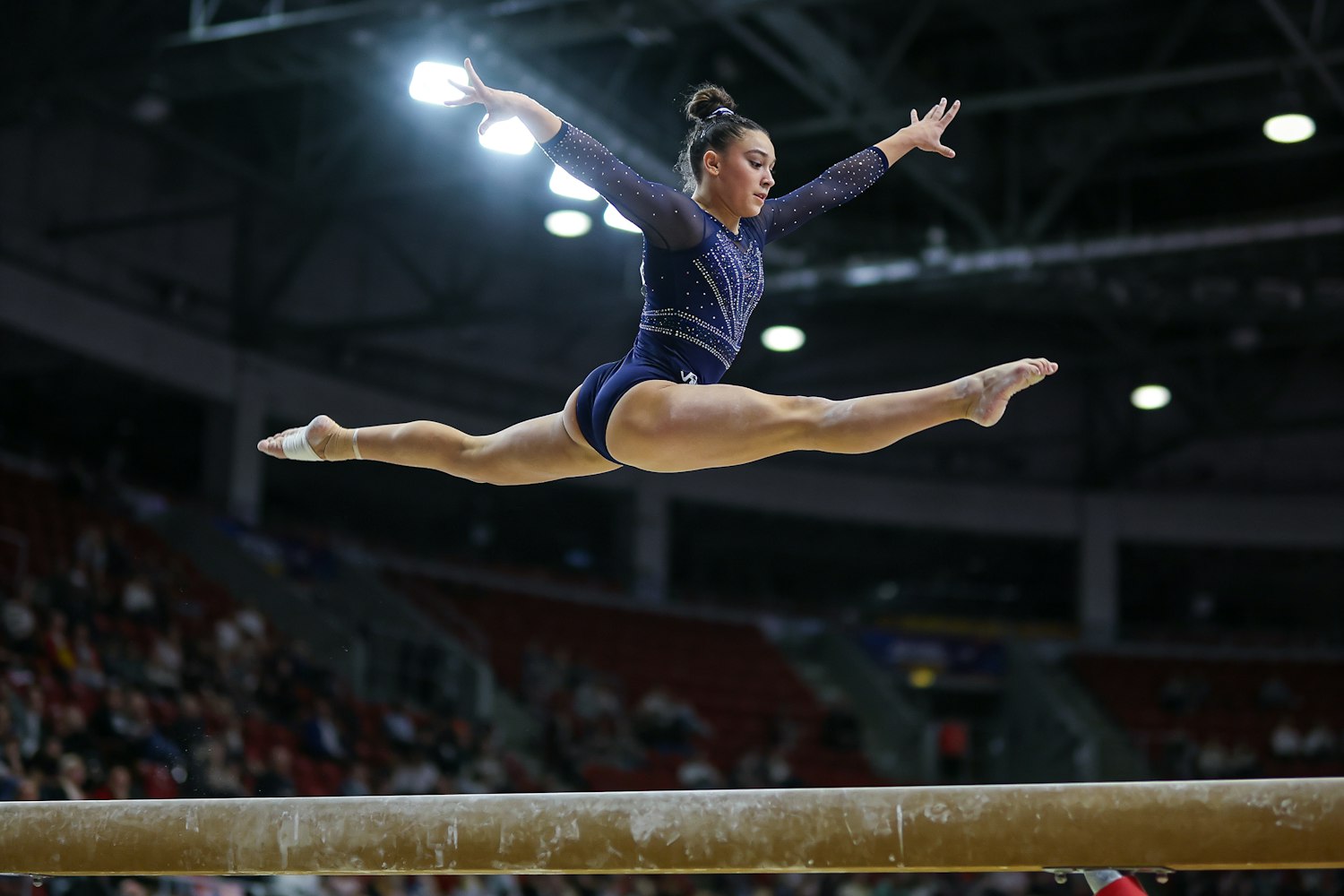 A gymnast in a navy leotard performs a split leap on the balance beam in a well-lit indoor arena.
