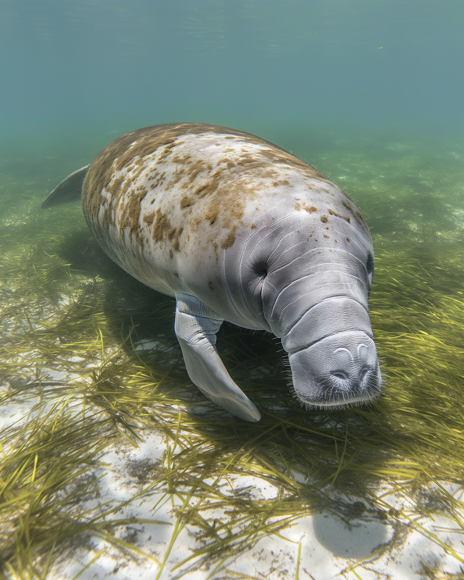 A serene underwater scene of a manatee swimming over seagrass in clear waters, showcasing its gentle nature and mottled skin pattern.