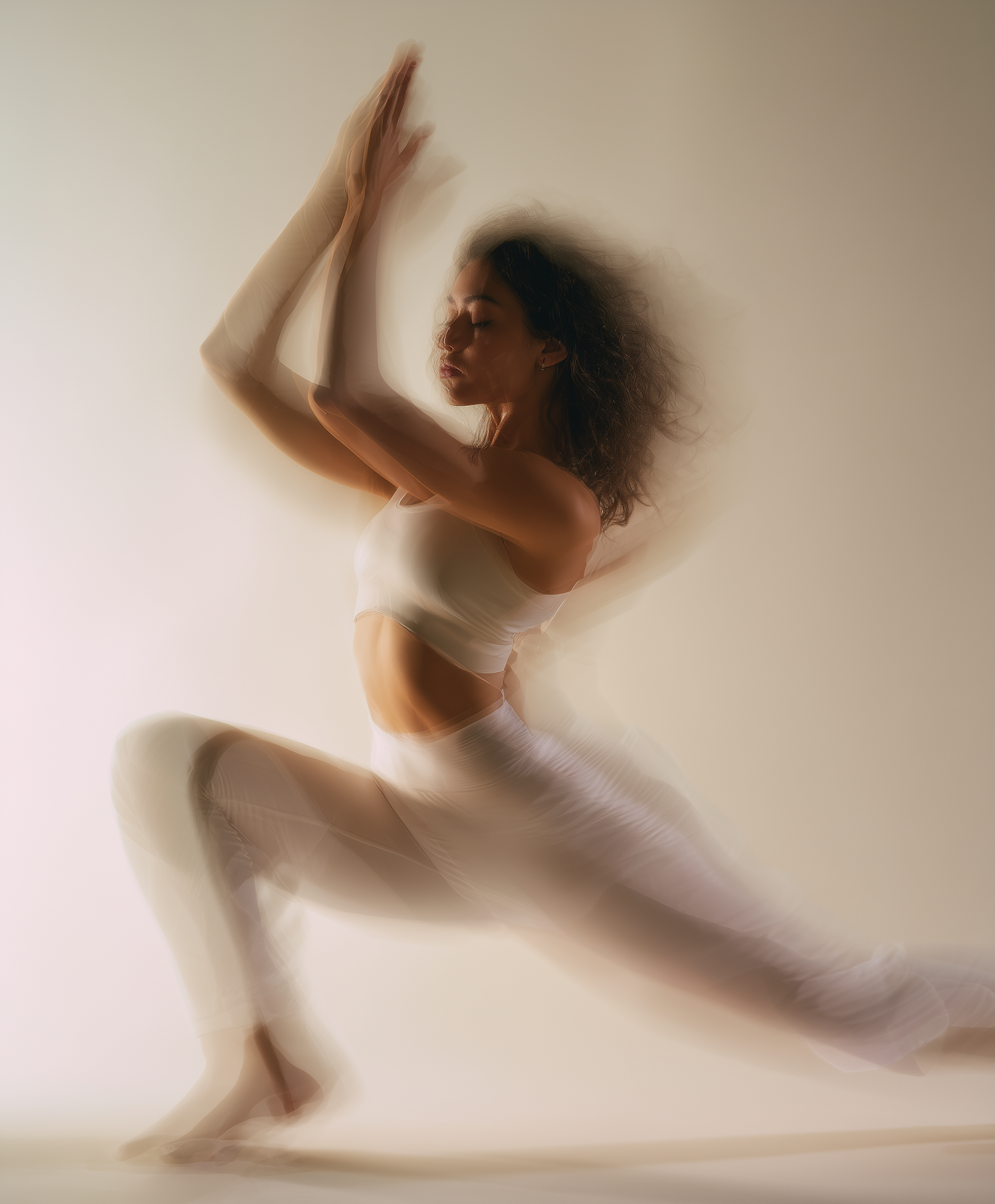 A serene woman in motion, wearing white, captured with a blur effect, creating a dynamic and ethereal visual.