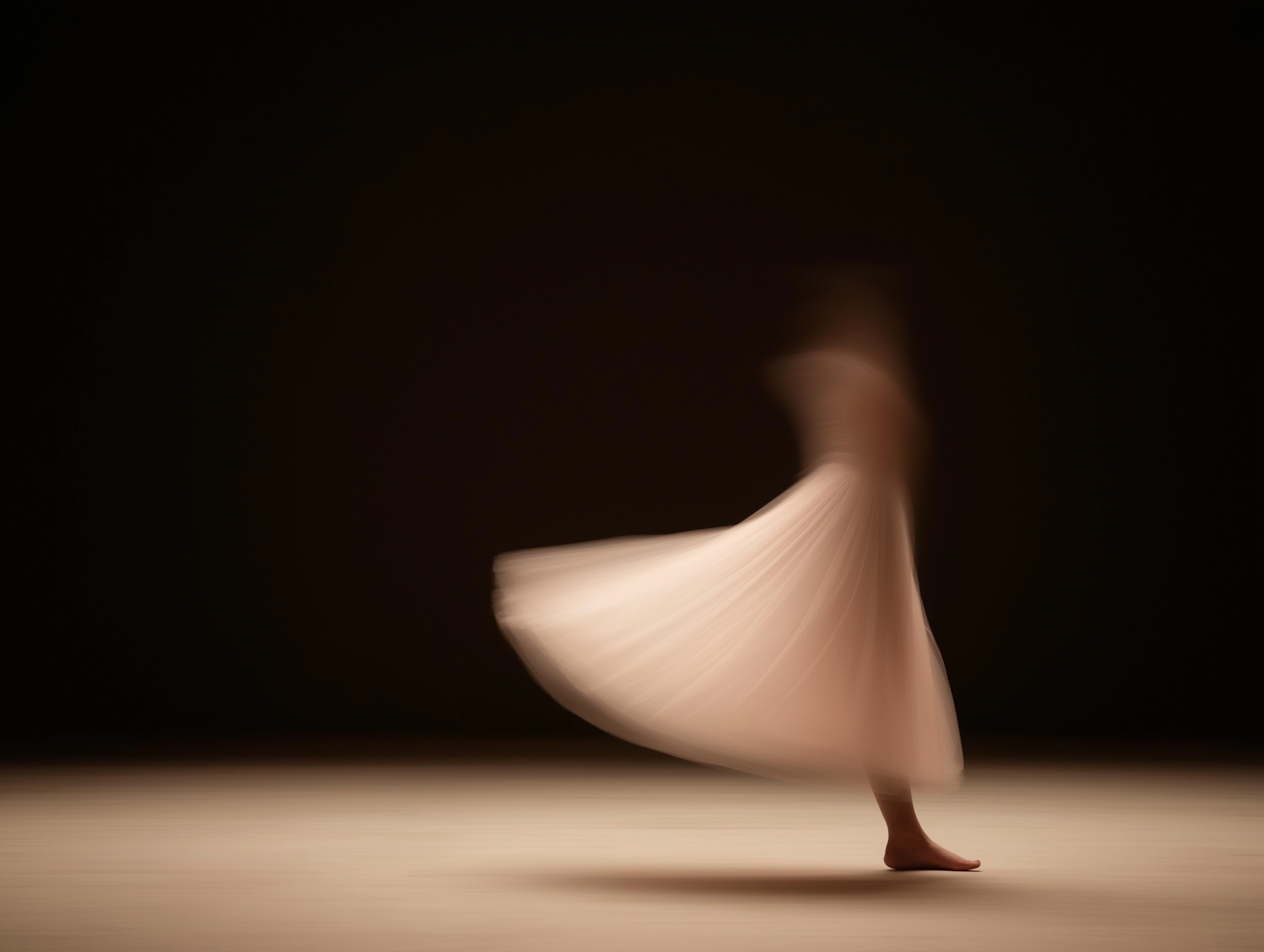 Blurred image of a dancer spinning gracefully in a flowing dress against a dark background, creating a dreamlike effect.