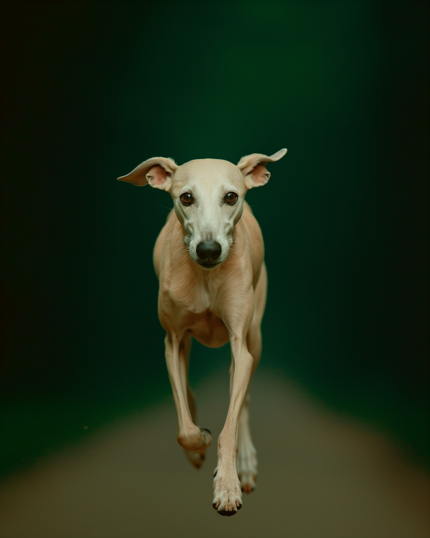 A graceful tan Greyhound or Whippet mid-stride against a dark green background, showcasing its sleek build and focused expression.