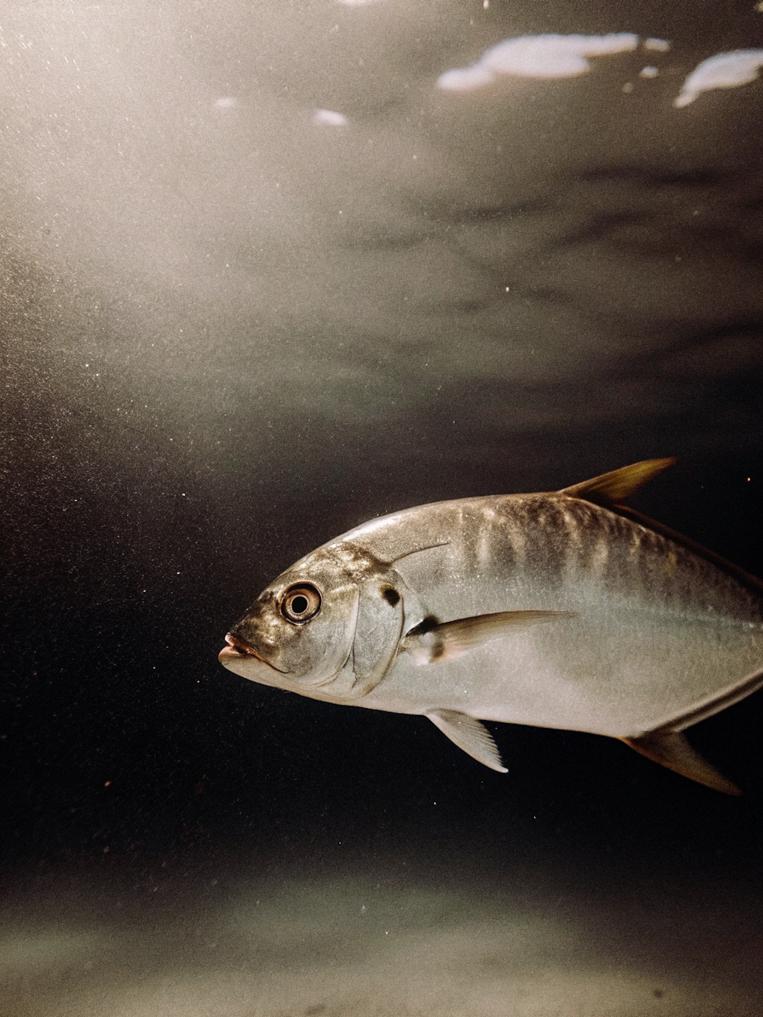 A silver fish with a metallic sheen swims in a dimly lit underwater scene, surrounded by murky water and soft light reflections.