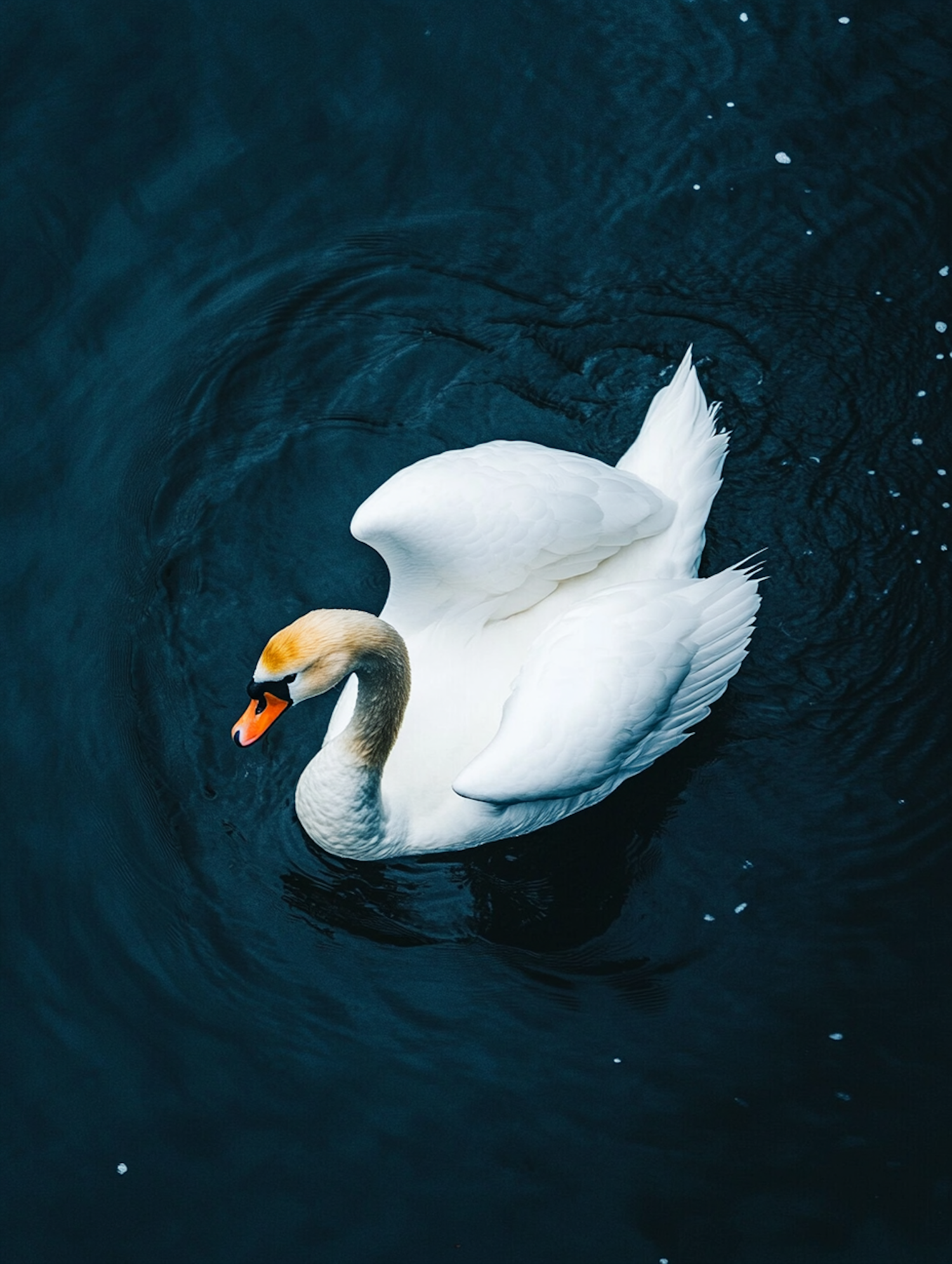 Elegant white swan gliding on deep blue water, creating gentle ripples. Striking contrast between the swan's feathers and the dark water.