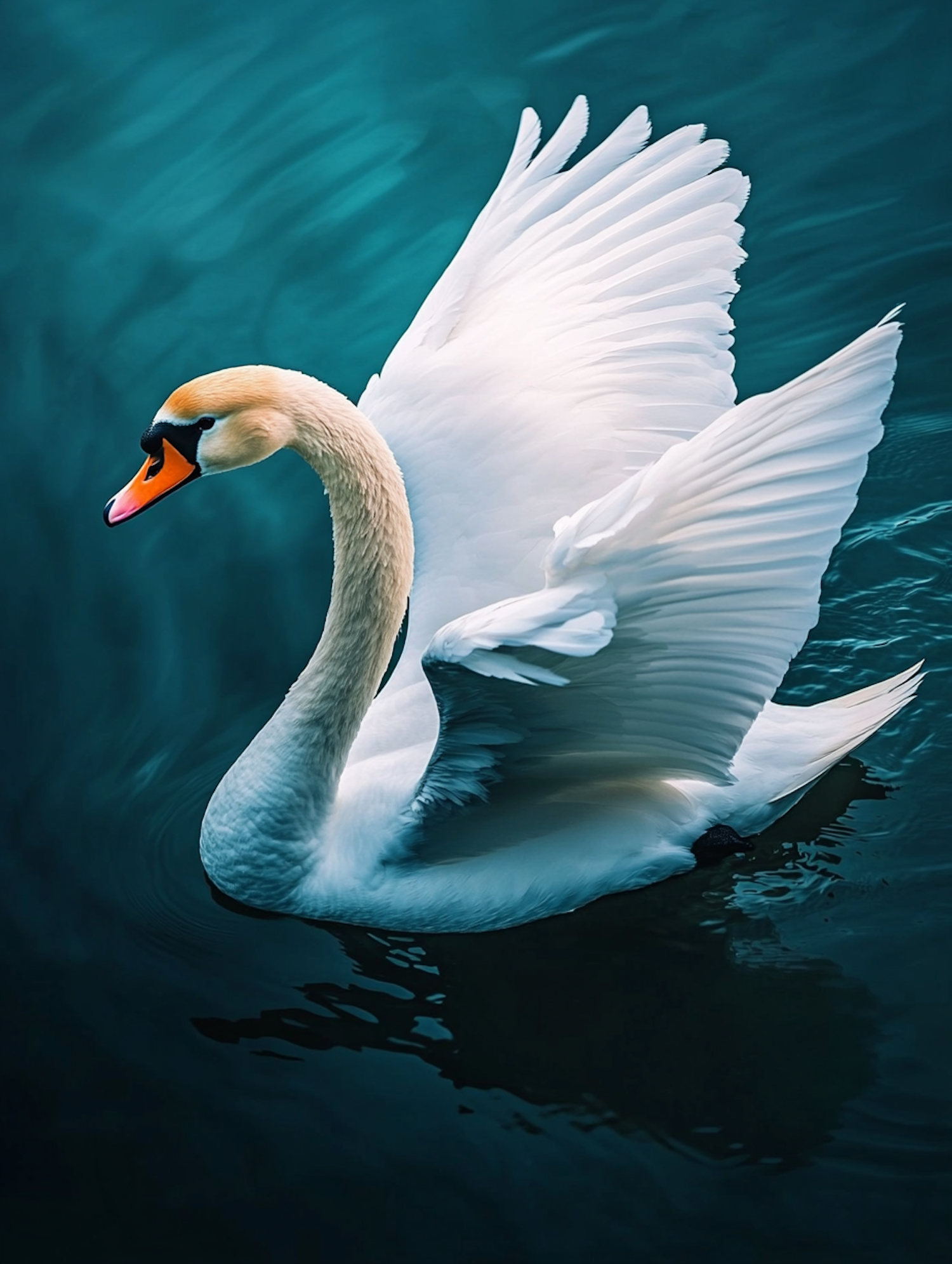 Majestic swan with spread wings gliding on teal water, showcasing elegant white feathers and an orange beak.