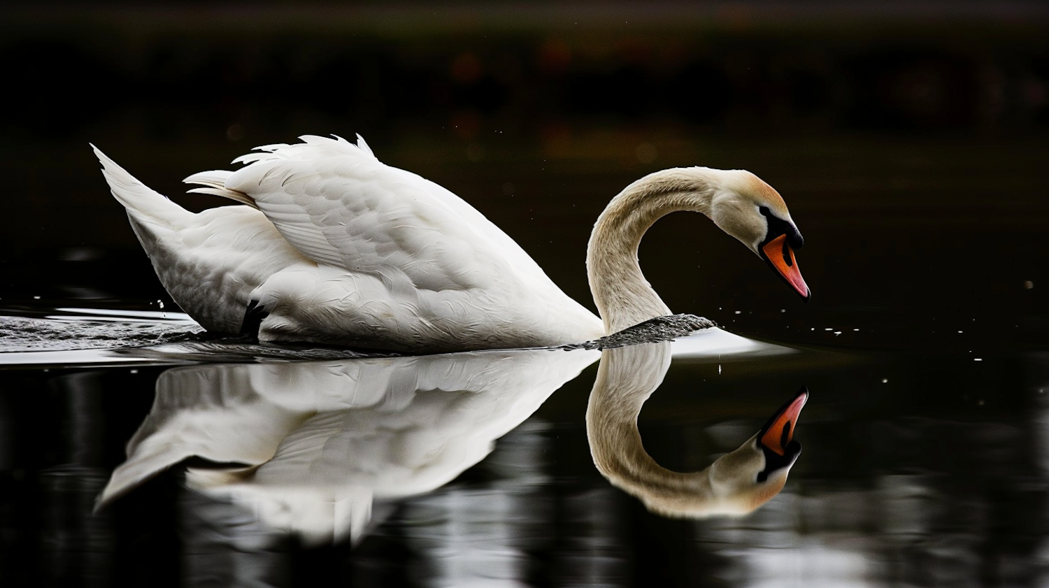 A serene swan glides on dark water, its reflection creating a perfect mirror image. Elegant and peaceful nature scene.