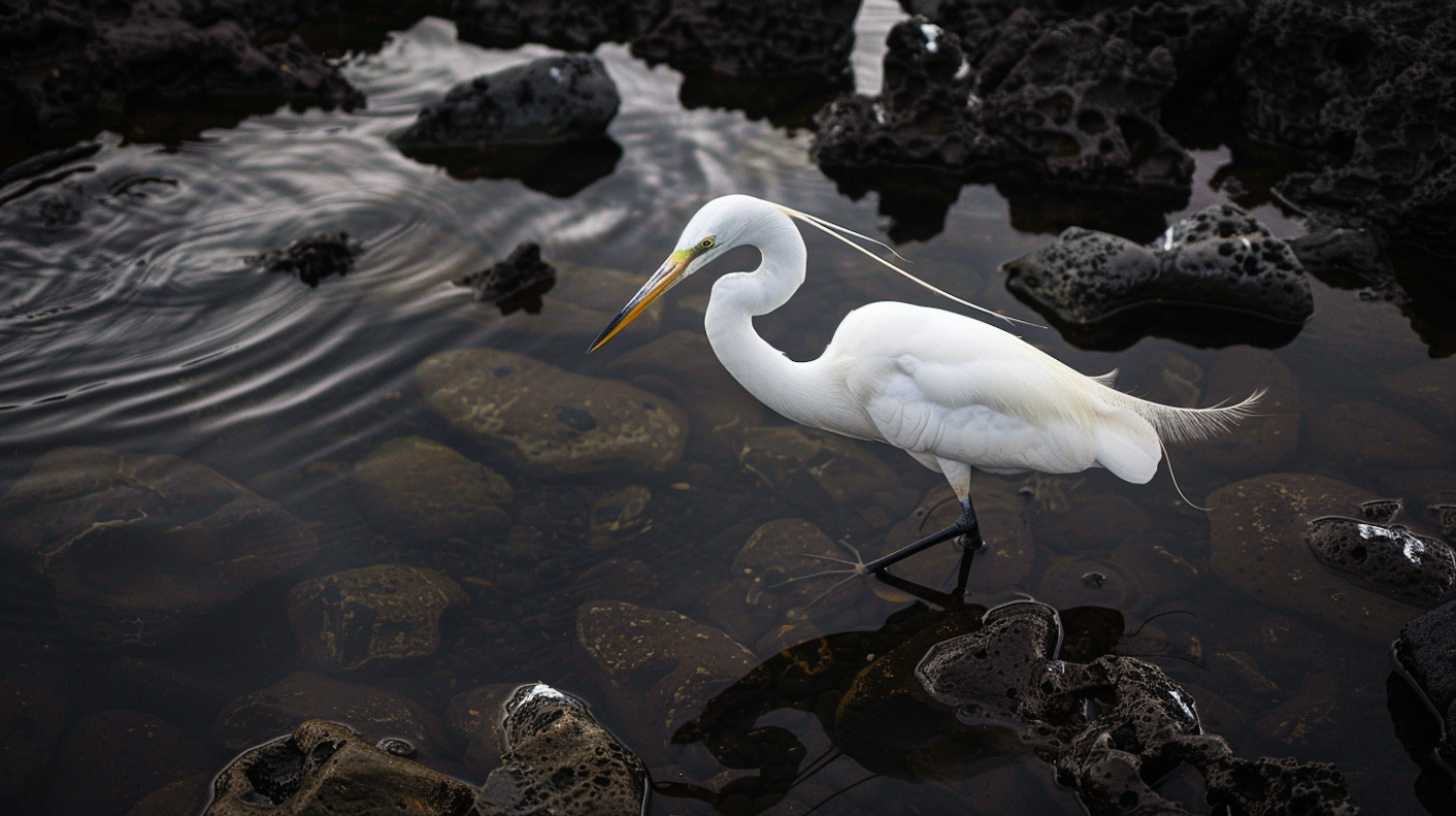 A white egret stands gracefully in shallow water, surrounded by dark rocks, with its orange beak adding a splash of color.