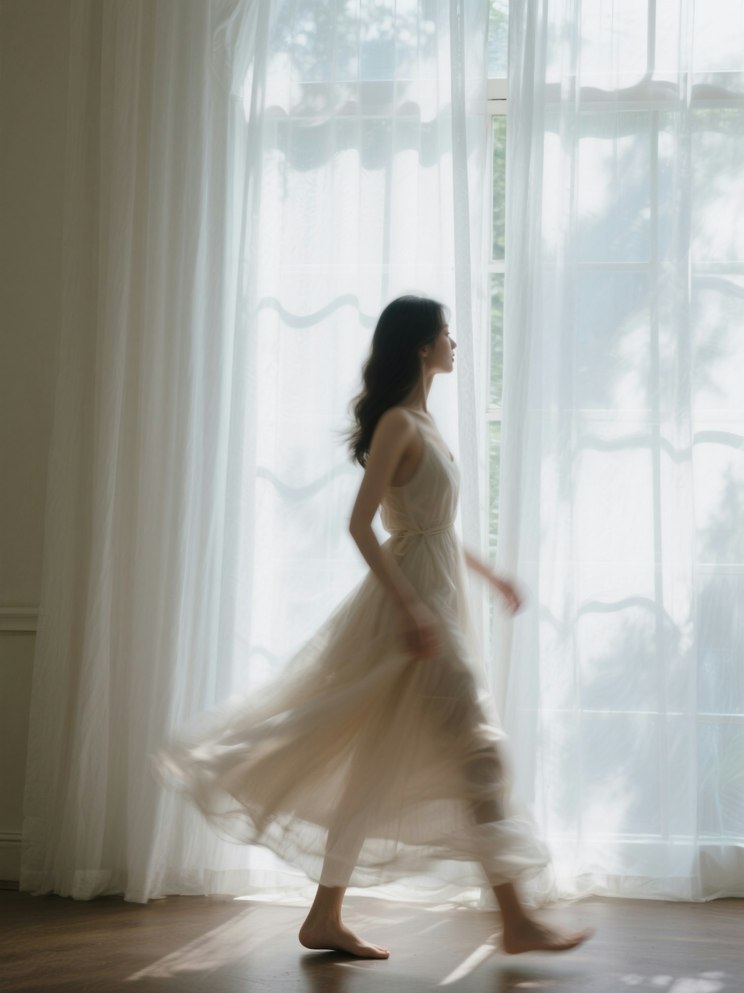 A woman in a flowing dress walks gracefully by a sunlit window with sheer curtains, creating a serene and ethereal atmosphere.