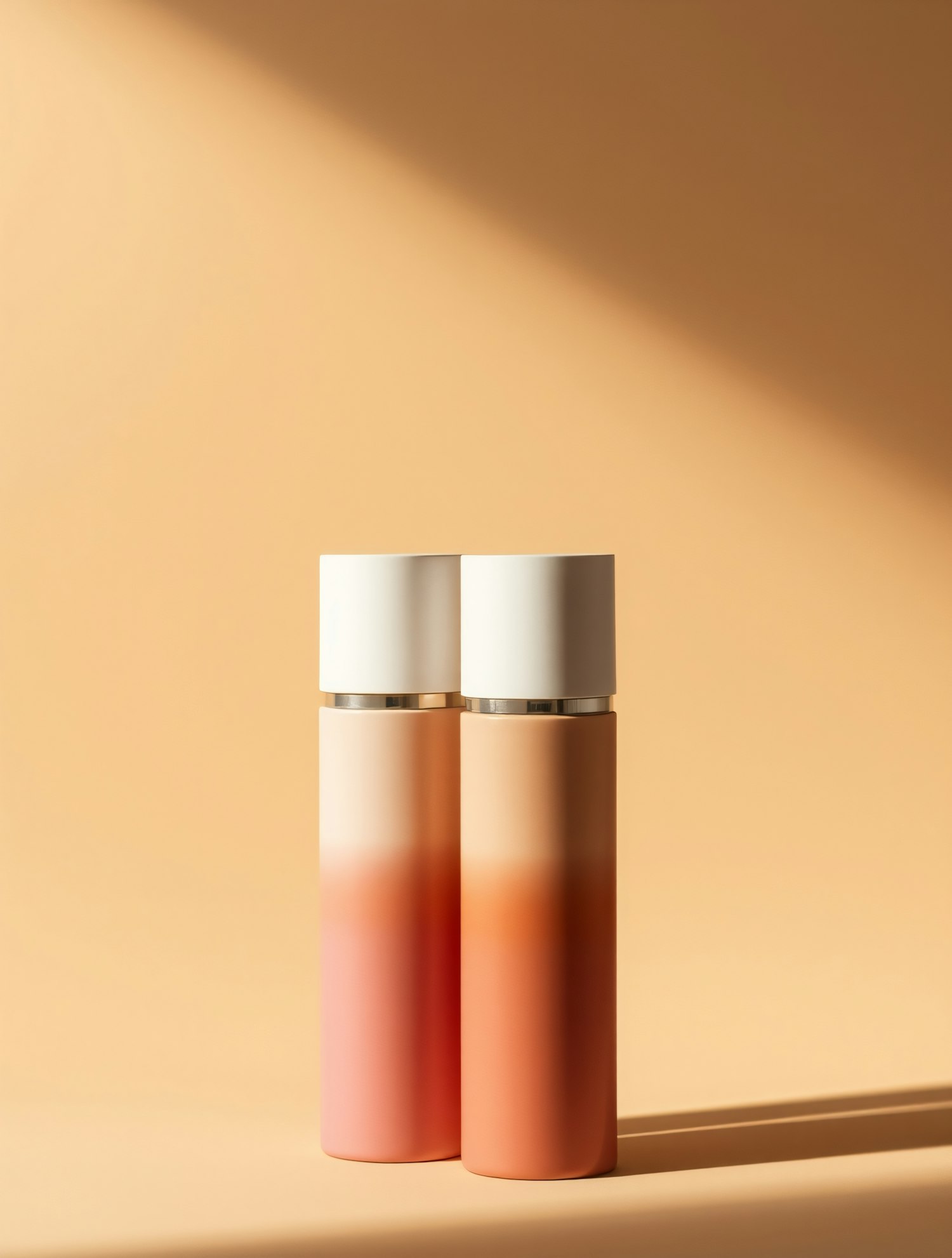 Two gradient bottles with white caps and metallic accents on a beige background, showcasing a minimalist and modern aesthetic.