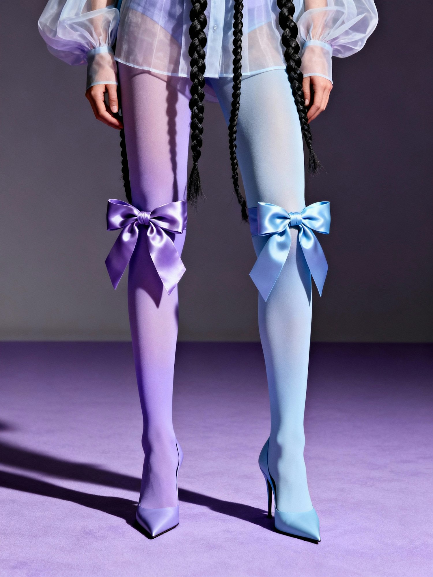 Editorial fashion photography, studio photoshoot, dramatic studio lighting, high-end fashion magazine style, sharp details, focus on avant-garde tights, bold styling, experimental composition, surreal editorial vibe. A female model seated directly on the floor, legs elegantly extended and crossed in front of her, styled in pastel gradient tights shifting from lavender to pale blue, oversized satin bows tied at the thighs. She wears a sheer blouse with voluminous sleeves, paired with minimal sharp heels. Her hair is styled in sculptural braids twisted into artistic forms. The background and floor are a seamless lavender studio backdrop, perfectly smooth with no horizon line. The composition is cropped to emphasize her legs and bows in a surreal editorial fashion shot.