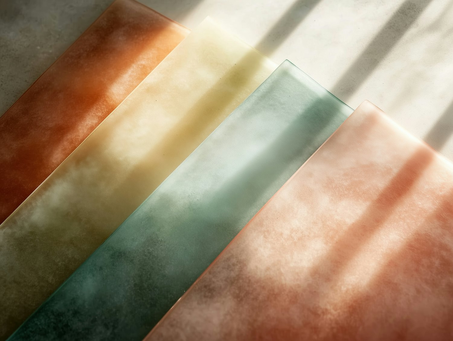 Diagonal frosted glass panels in warm orange, yellow, teal, and pink hues, illuminated by sunlight with soft shadows.