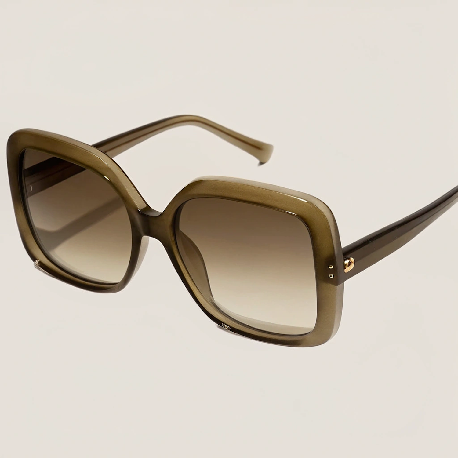 Chic oversized square sunglasses with a glossy olive-green frame, gradient lenses, and gold accents for a modern, stylish look.
