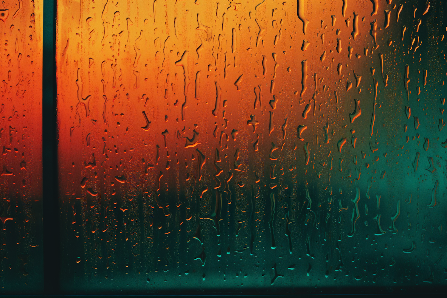 Vibrant raindrops on a window with a gradient from orange to teal, creating a serene and textured visual effect.