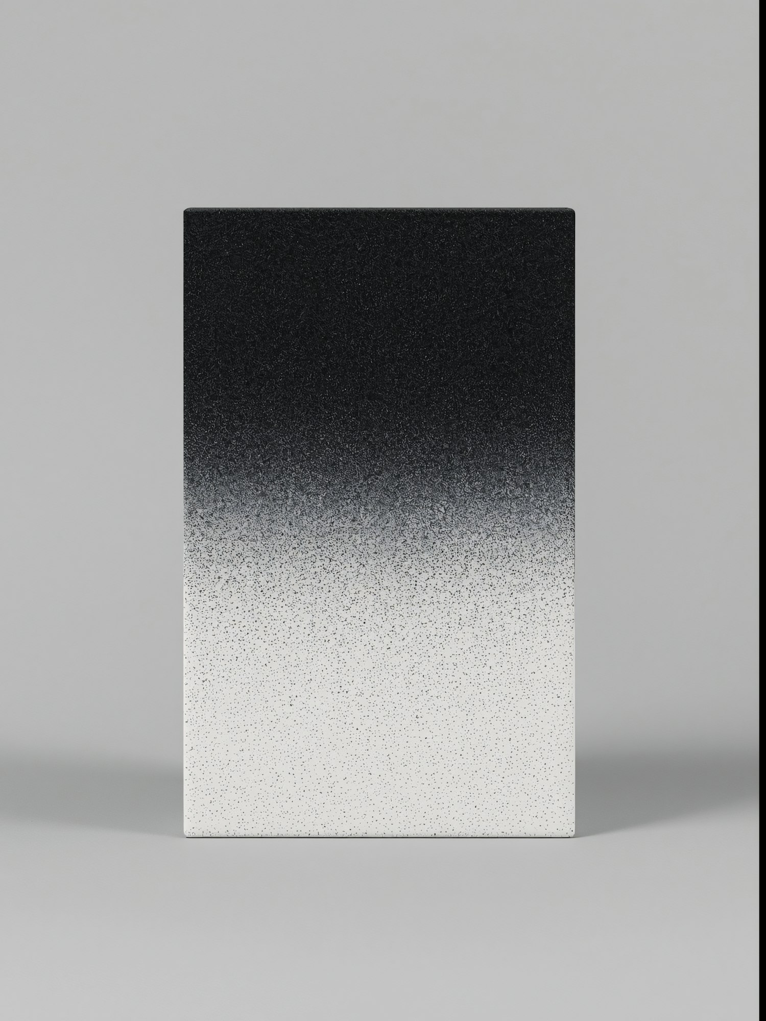 A rectangular object with a black-to-white gradient and speckled texture, set against a neutral background.