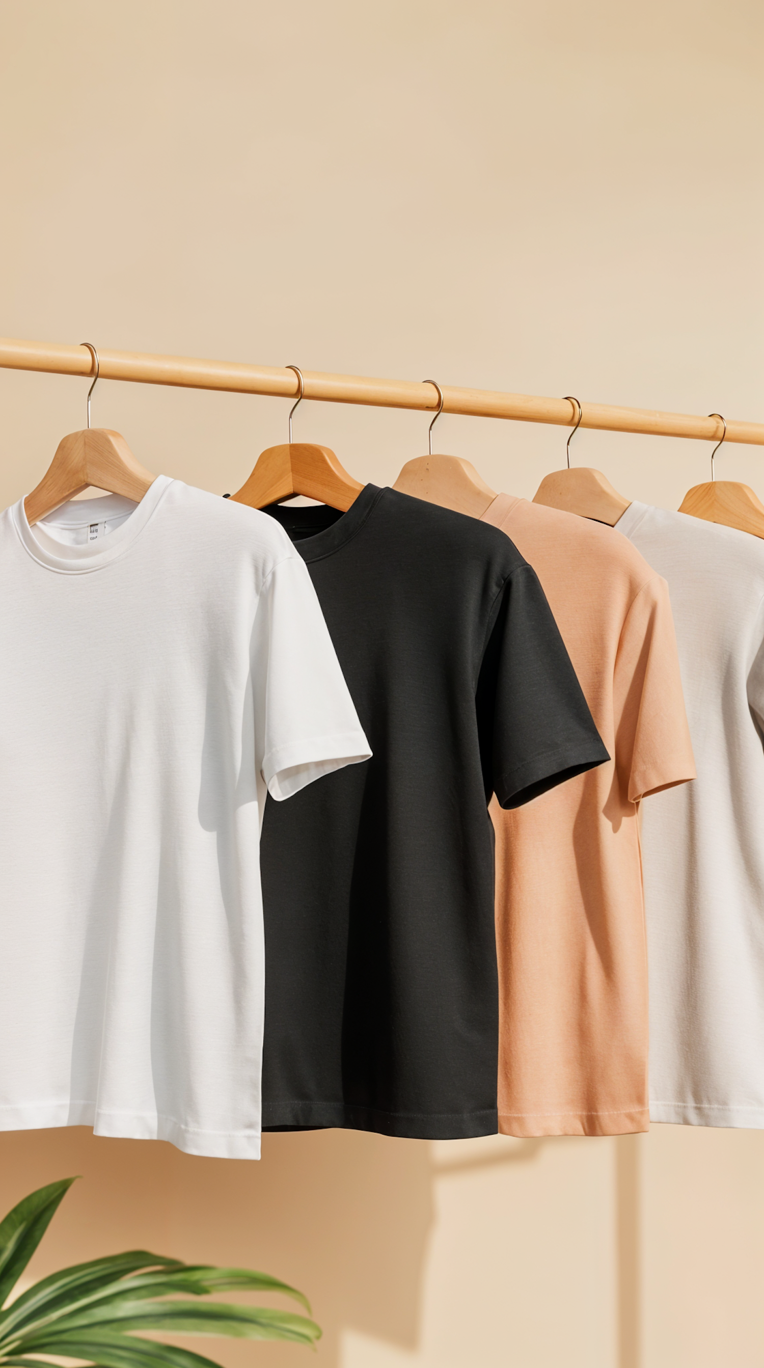Stylish t-shirts in white, black, peach, and beige hang on wooden hangers against a beige backdrop, with a green plant accent.