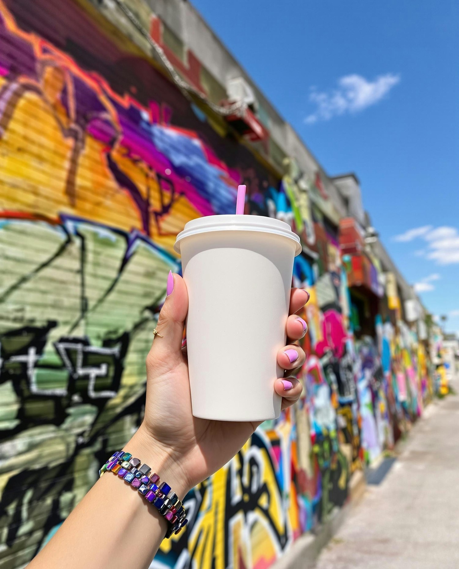 A hand with pink nails holds a white cup with a pink straw in front of a colorful graffiti wall under a bright blue sky.